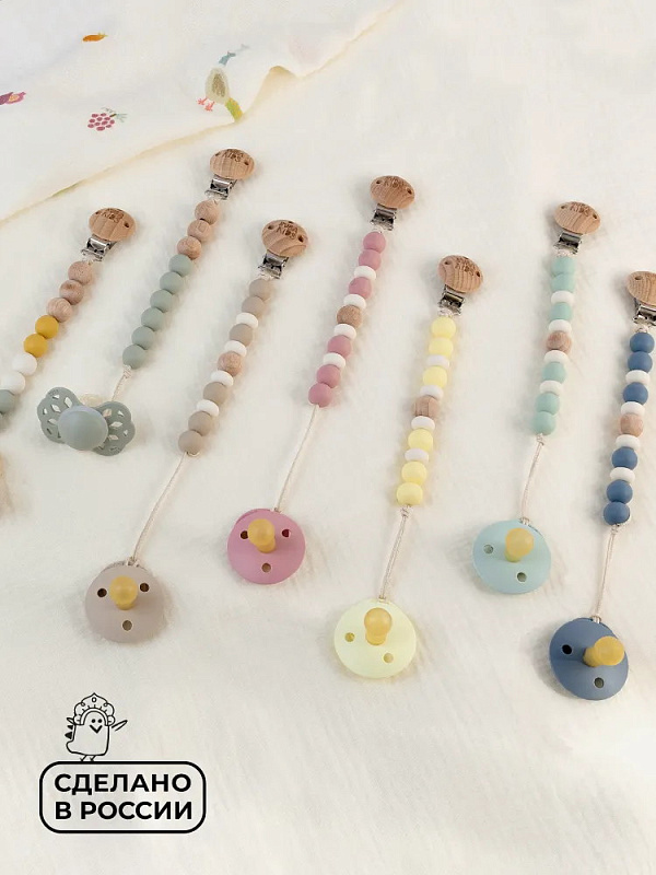 Малышам нравятся красивые и приятные на ощупь бусины, похожие на конфетки. Теперь любимая пустышка не потеряется и не упадет на пол.