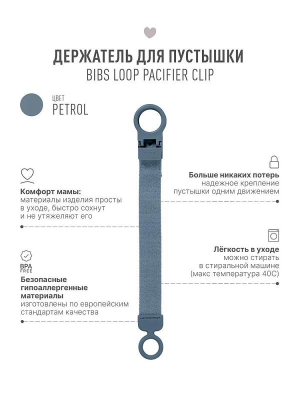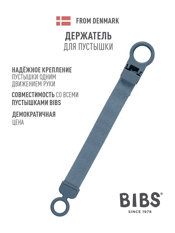 - Держатель очень прост в использовании: прикрепите клипсу к одежде малыша, и пустышка больше не потеряется и не упадет на пол. К нему можно подобрать пустышку BIBS с аналогичным принтом.