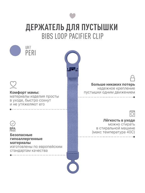 - гибкое силиконовое кольцо, которое надежно крепится ко всем пустышкам BIBS и большинству популярных моделей пустышек;