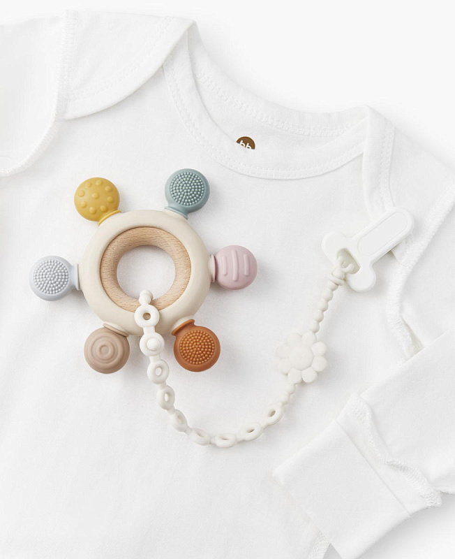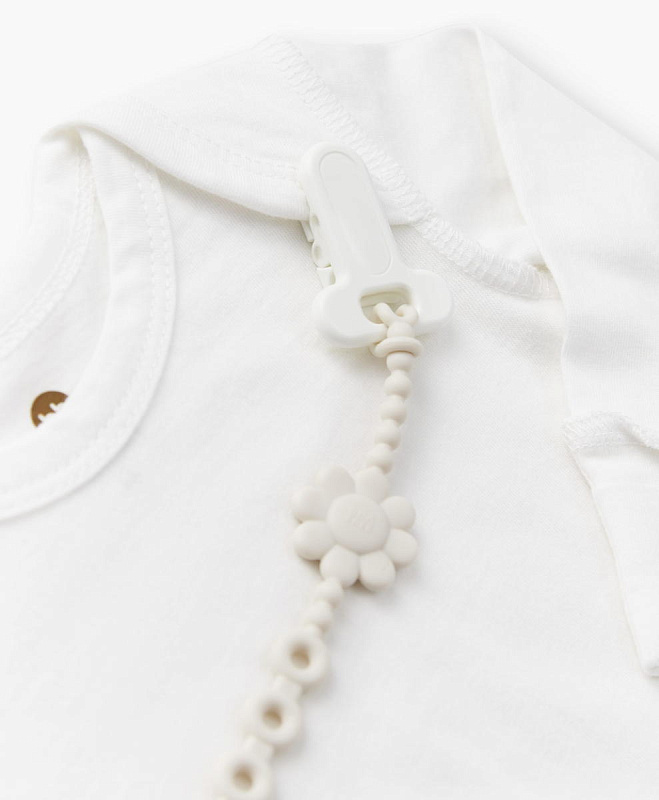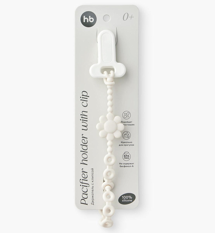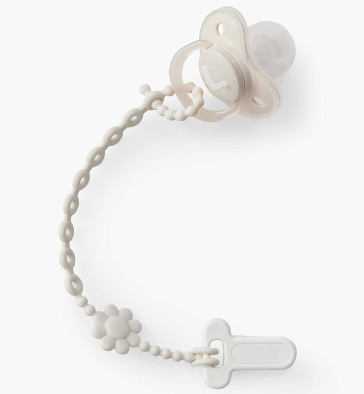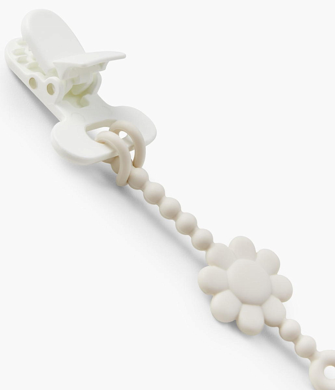 Гибкий силиконовый держатель сохранит пустышки и прорезыватели ребенка в чистоте. Крепится на одежду с помощью клипсы. Ремешок держателя можно грызть.
