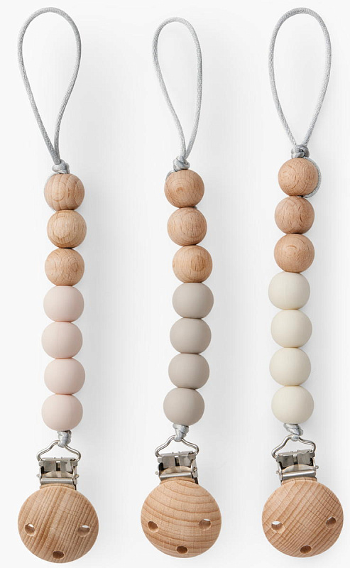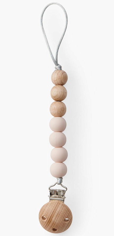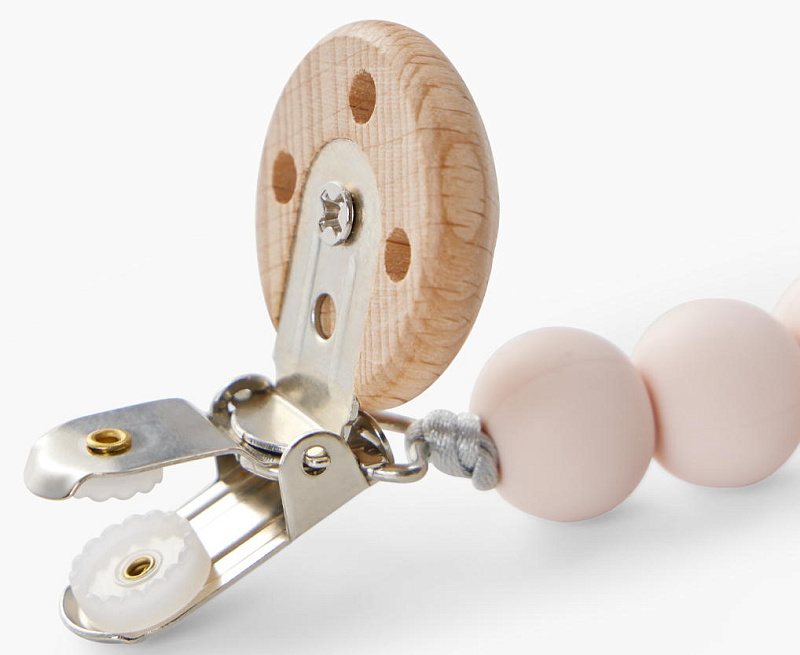 Держатель с бусинками из мягкого силикона, натурального дерева и с надёжным креплением-прищепкой - теперь вы можете быть уверены, что пустышка или прорезыватель не потеряются и всегда будут чистыми. Компактный держатель удобно брать с собой на прогулки и в длительные поездки.