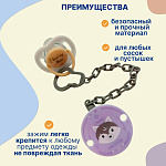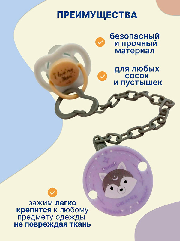 Легко крепится и надёжно держится на любой детской одежде. Держатель подходит для большинства пустышек с кольцом, он имеет очень простое крепление. Три модных и стильных дизайна.