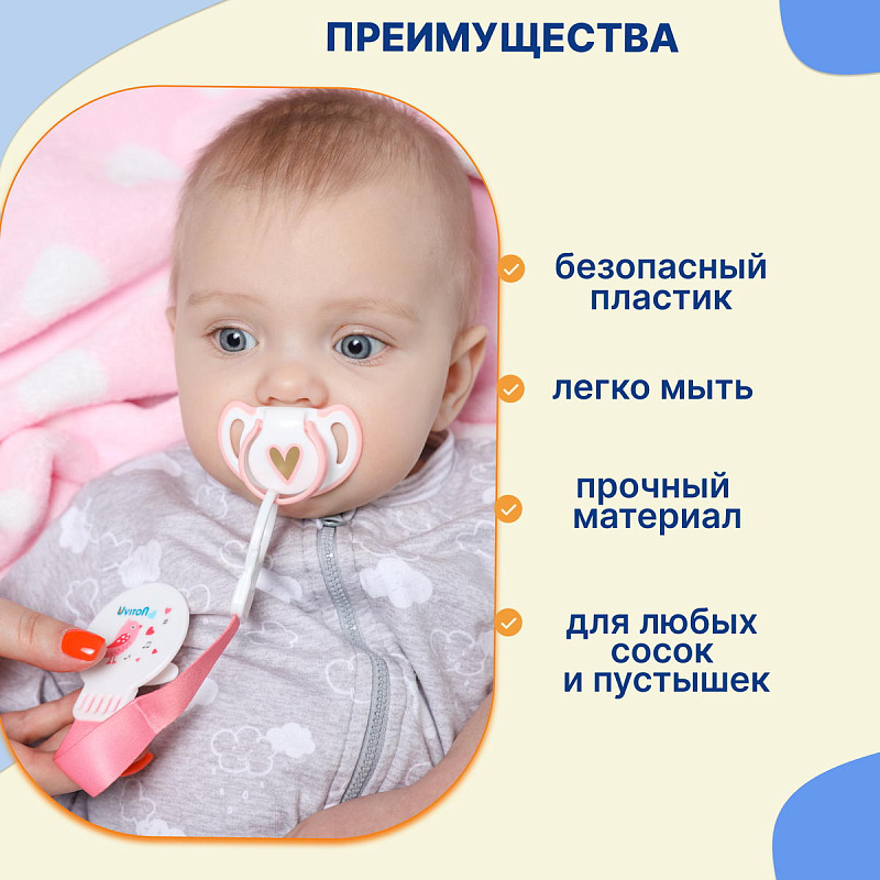 Держатель для пустышки Uviton Ленточка 0068 – мамин помощник Данный атрибут отлично справится с задачей: не потерять соску ни на улице, ни дома. Держатель для пустышки Uviton Ленточка 0068 купить практично на сайте: онлайн. Преимущества: • Хорошего качества модель подойдет малюткам возрастной категории: с первых дней жизни. • Красивый дизайн подчеркнет стиль непоседы. • Простое крепление – надежная фиксация на одежке крохи. • Можно промывать теплой водой для соблюдений требований гигиены.