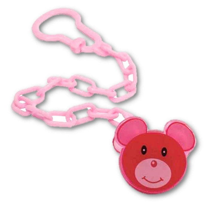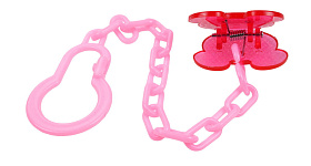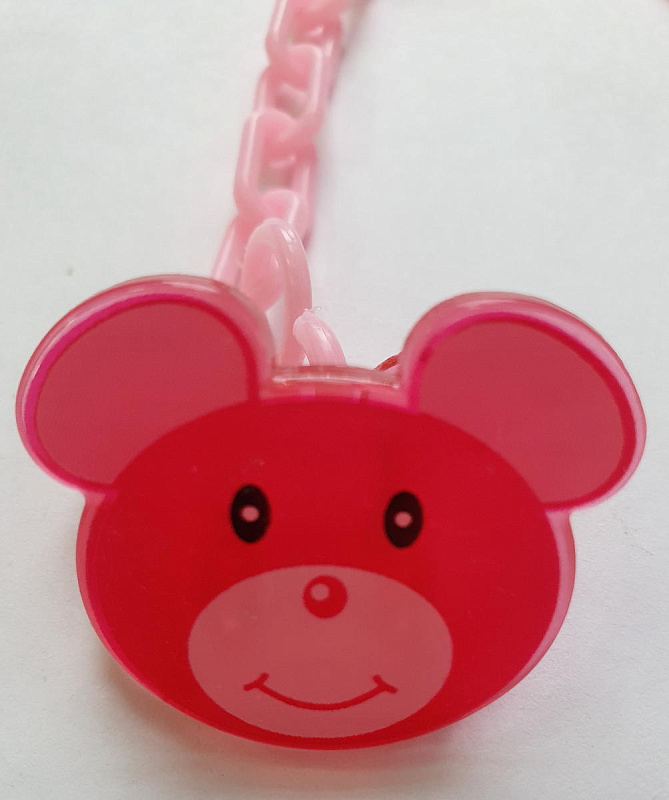 Изделие представляет собой цепочку, выполненную из округлых звеньев, и имеющую специальную клипсу для крепления к одежке владельца, украшенную изображением забавного мышонка. Ко второму ее концу легко и просто крепится кольцо пустышки.
