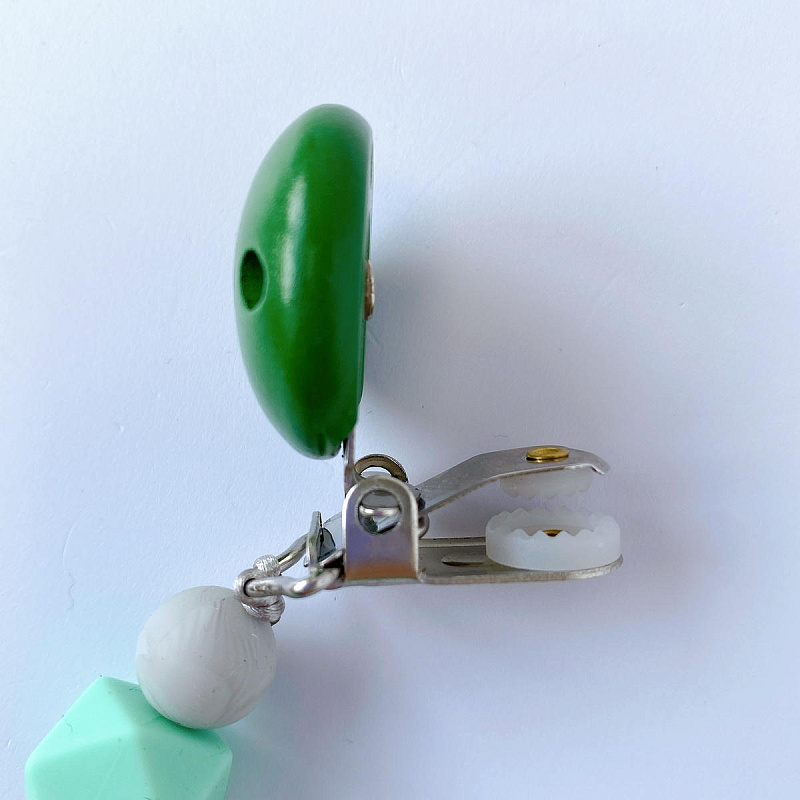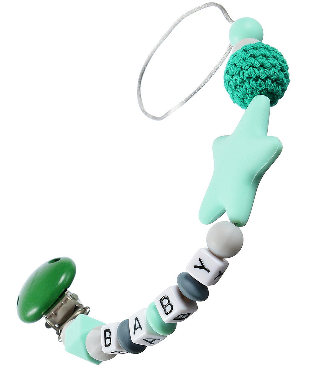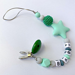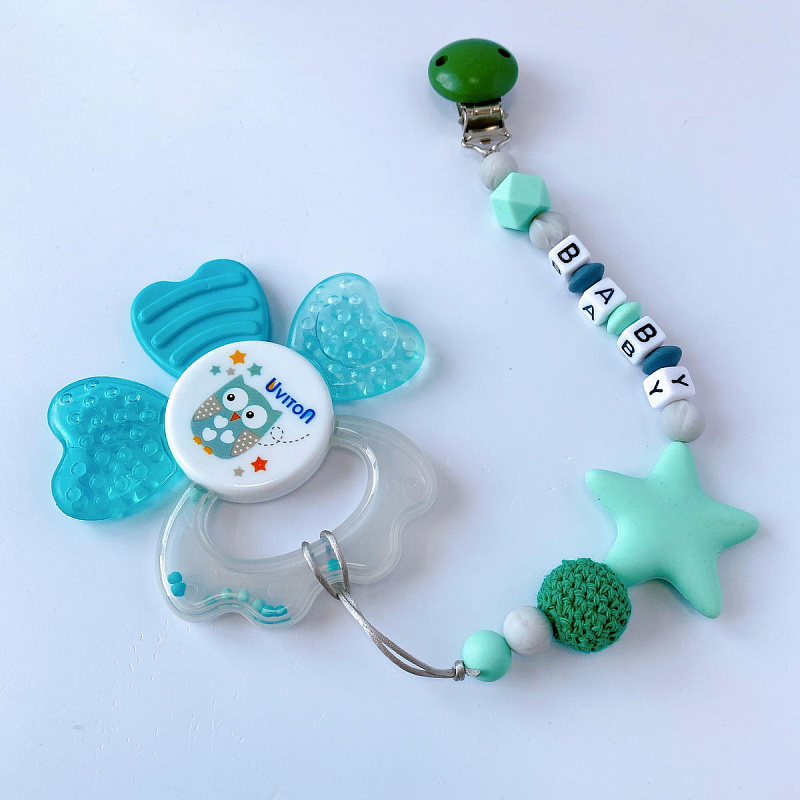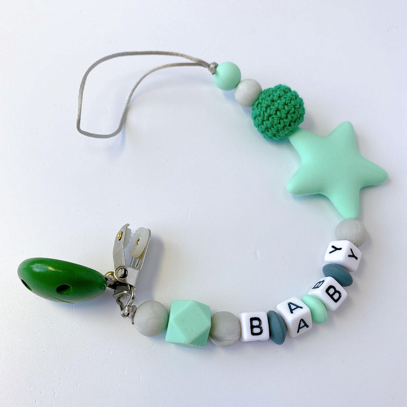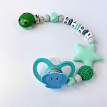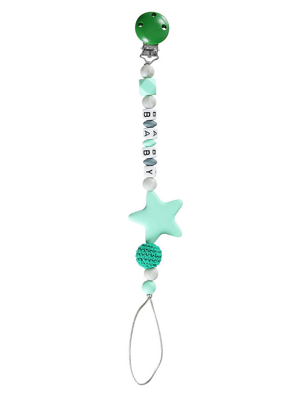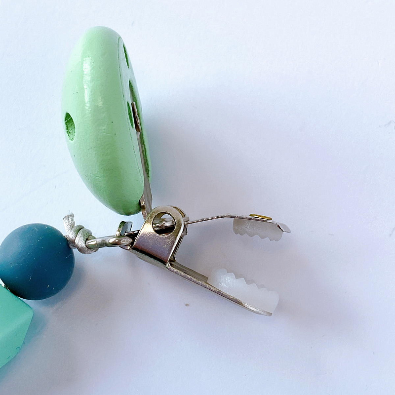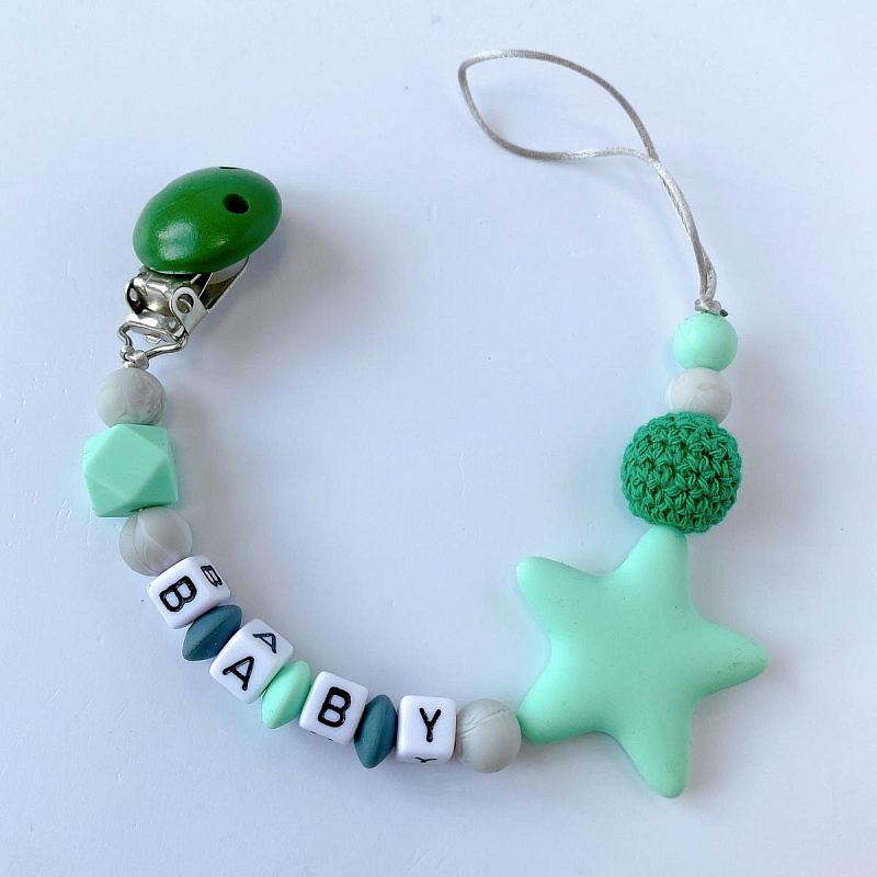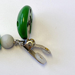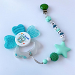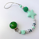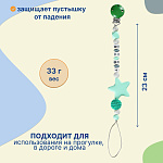 Держатель универсален, на него можно закрепить не только пустышку, но и прорезыватель или игрушку. Держатель современного дизайна изготовлен из безопасных материалов, таких как пищевой силикон, пластик. Бусины нанизаны на веревочку и имеют разную форму, большая бусина обвязана ниточками, это способствует стимулированию развития мелкой моторики, учит формам и фактурам.