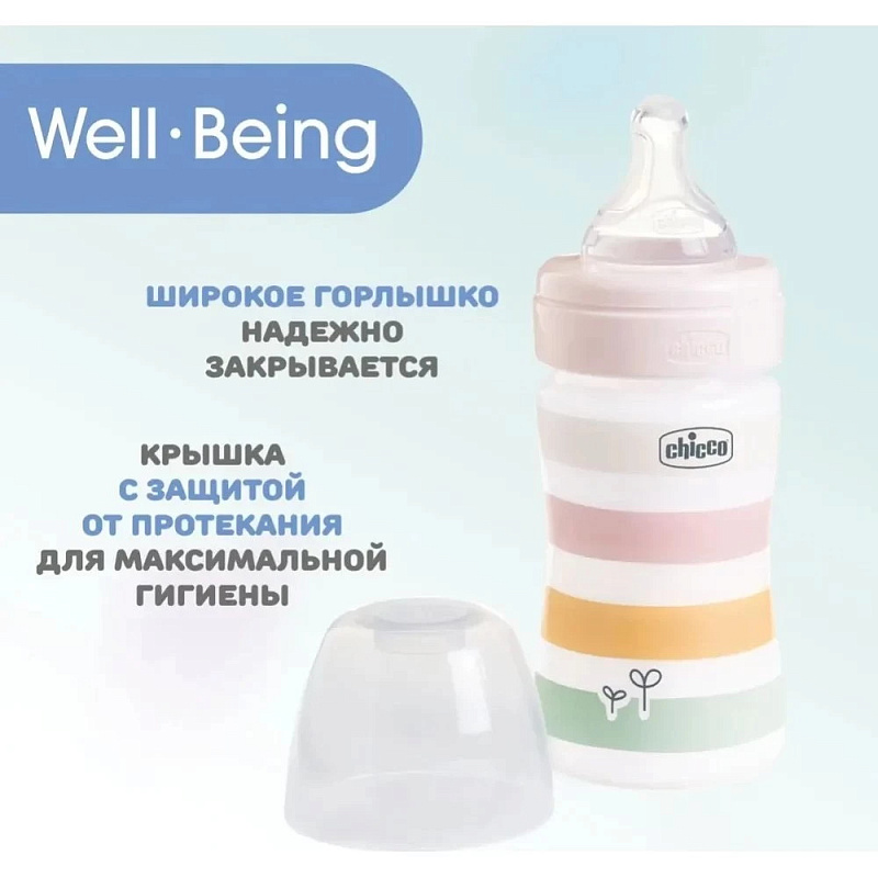 Бутылочки Chicco серии Well-Being доступны в 3 размерах: 150 мл, 250 мл и 330 мл. Рекомендуется использовать бутылочку серии Well-Being с сосками серии Well-Being или Perfect5. В комплект входит крышка для гигиены.
