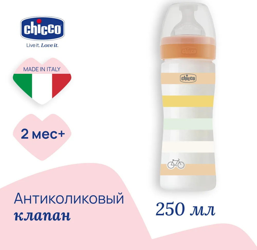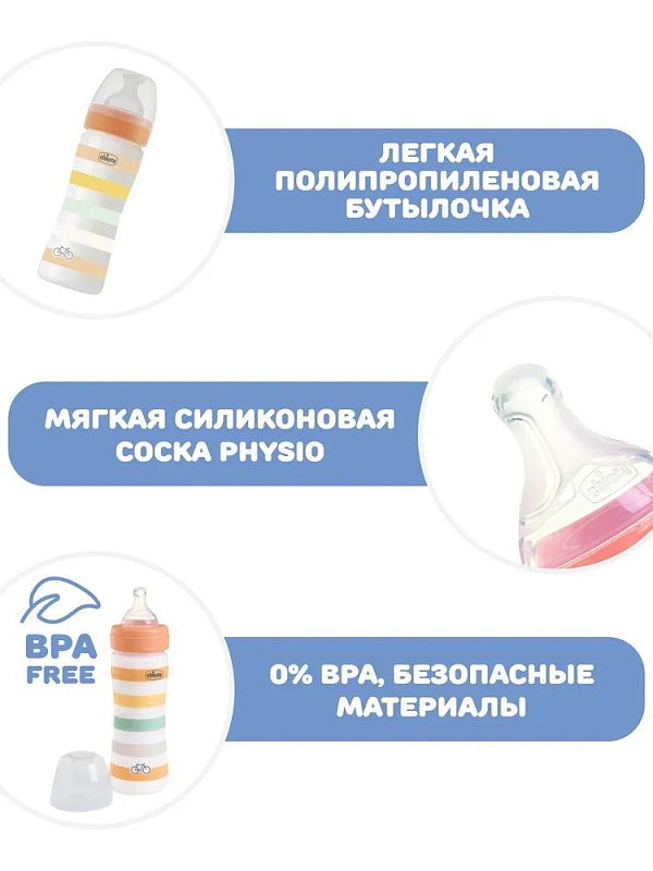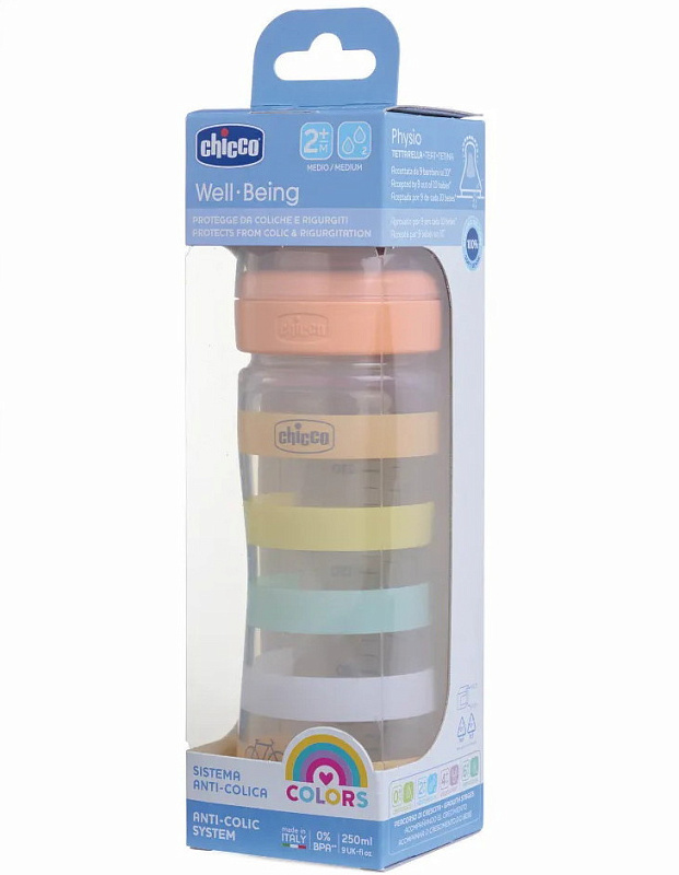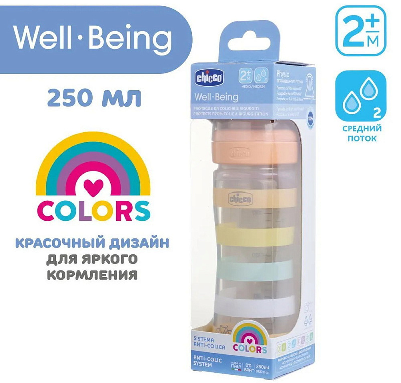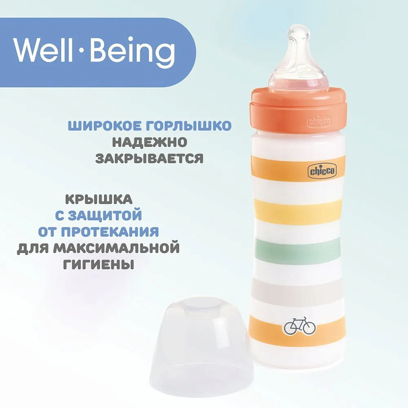 Бутылочки Chicco серии Well-Being доступны в 3 размерах: 150 мл, 250 мл и 330 мл. Рекомендуется использовать бутылочку серии Well-Being с сосками серии Well-Being или Perfect5. В комплект входит крышка для гигиены.