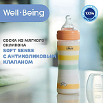 Мягкая и эластичная соска Well-Being позволяет легко переходить от грудного вскармливания к кормлению из бутылочки и наоборот. Покрытие соски Soft Sense дает вашему ребенку приятное и естественное ощущение, эмитируя рельеф кожи маминой груди. Во время кормления соска идеально адаптируется к рту ребенка и способствует естественному сосанию.