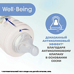 Широкое основание соски помогает обеспечить правильный захват соски и сохранить рефлекторное сосательное движение. Антиколиковый клапан снижает вероятность попадания воздуха во время кормления ребенка и риск возникновения колик.