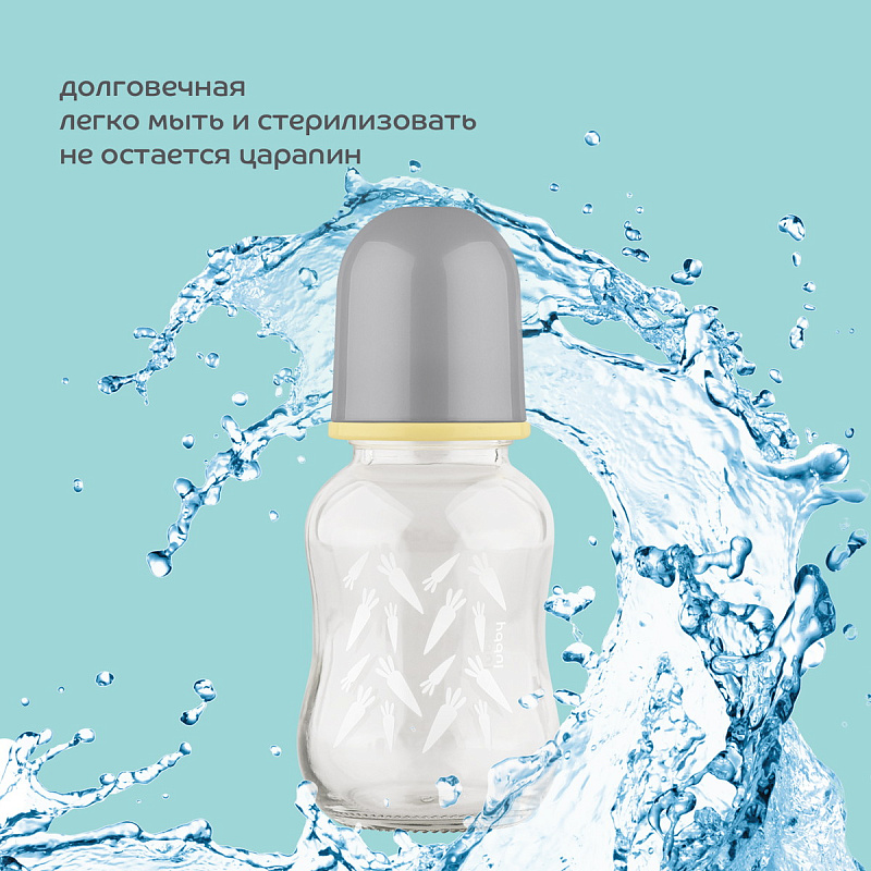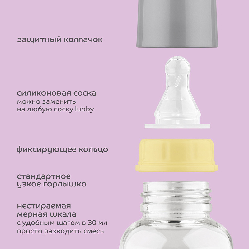 Стеклянная бутылочка для кормления оснащена силиконовой молочной соской медленного потока. Стекланные бутылочки более износостойкие, не окрашиваются под воздействием красящих веществ, содержащихся в еде, полностью безопасны и экологичны. Силиконовые соски упругие, что способствует развитию жевательного аппарата, не вызывают аллергию. Бутылочка имеет приталенную форму благодаря чему удобно размещаются в руке. Выпуклая, нестираемая шкала имеет оптимальный шаг в 30 мл. Колпачок защищает соску от загрязнения и не позволяет жидкости из бутылочки протекать. К бутылочке подходят все молочные соски lubby как латексные, так и силиконовые для бутылочек со стандартным (узким) горлышком.