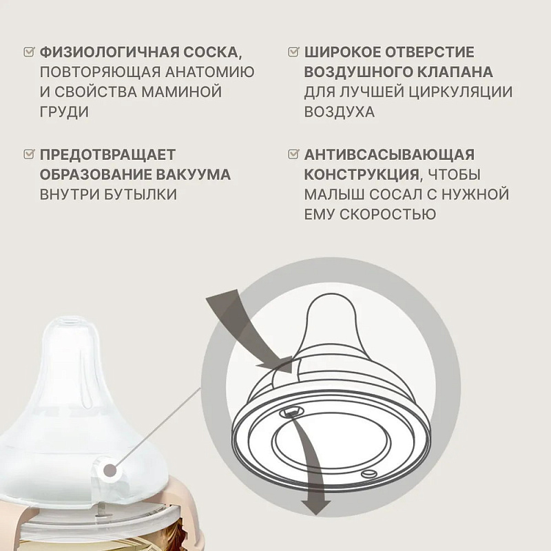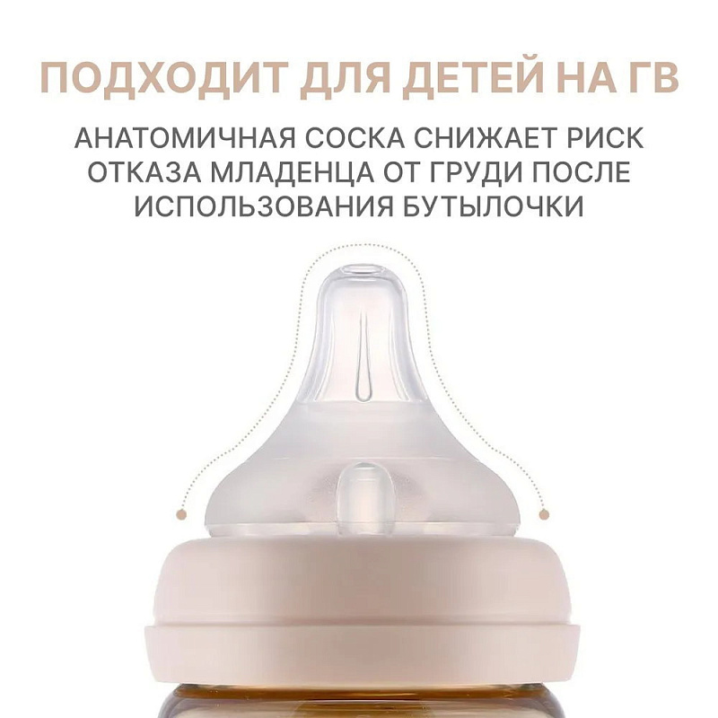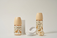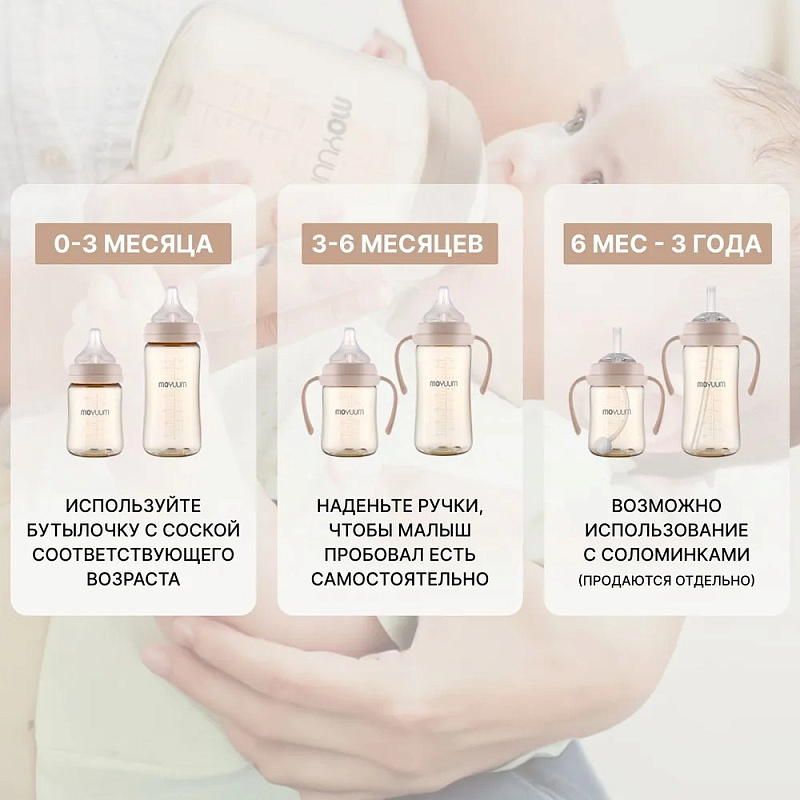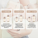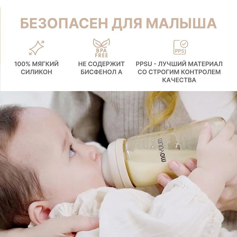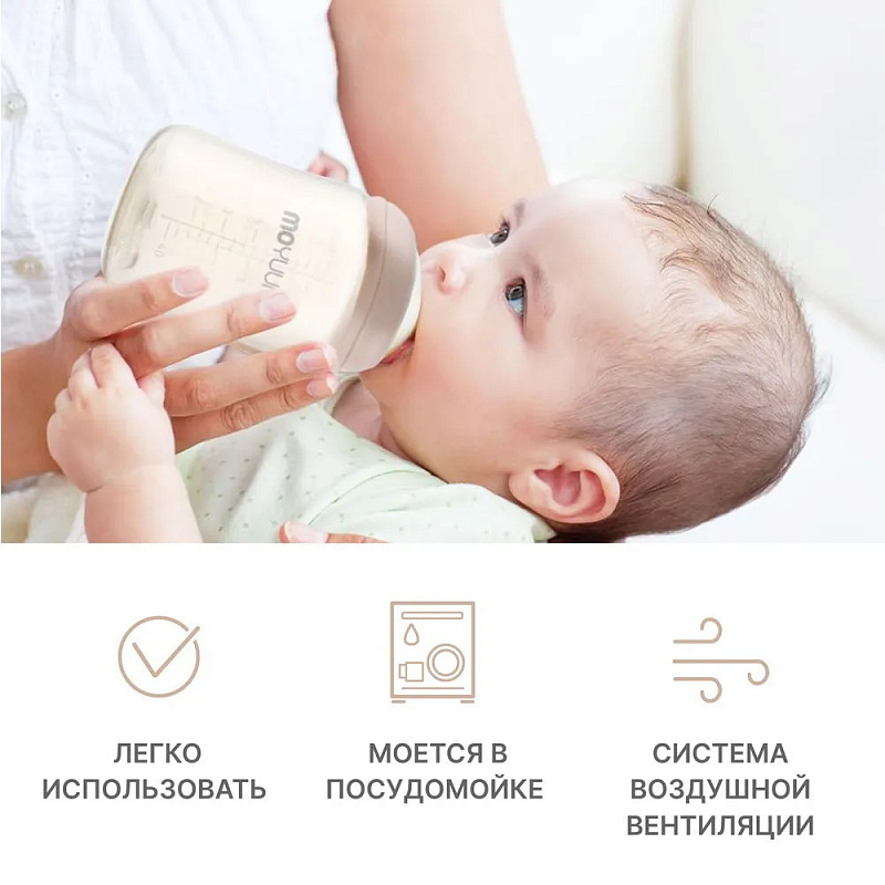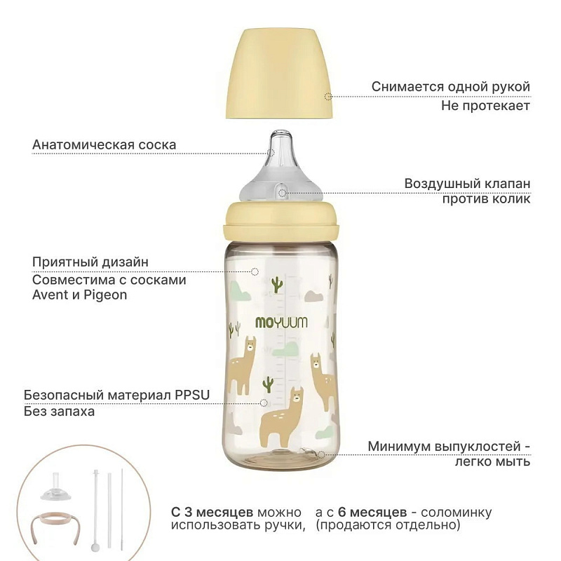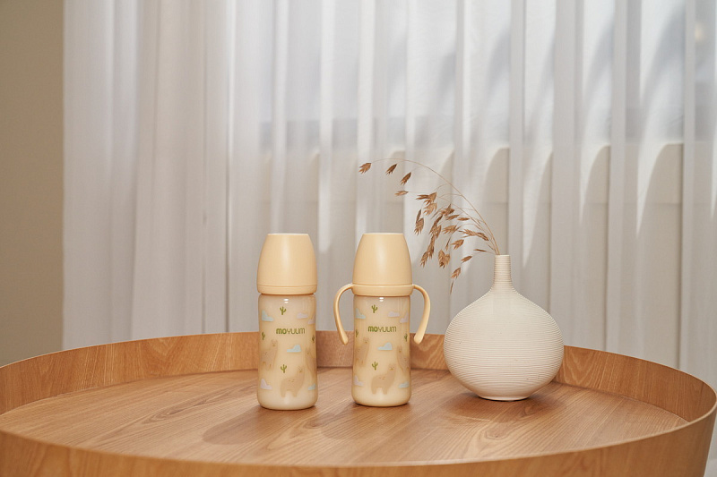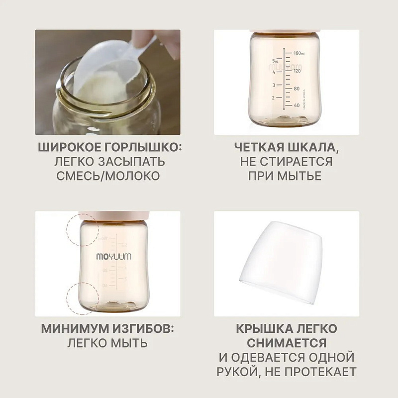 Бутылочка Moyuum разработана специально для младенцев от 0+ месяцев и продумана до мелочей. Используется для питания и в вертикальном, и в горизонтальном положении благодаря своим конструктивным особенностям. Антиколиковый воздушный клапан эффективно предотвращает заглатывание воздуха. Такая противоколиковая система снижает риск газообразования, возникновения колик, а также предупреждает срыгивания. Специальная конструкция дает ребенку возможность сосать в своем темпе и с комфортной скоростью. Анатомическая соска полностью имитирует материнскую грудь и обеспечивает ее правильный захват. Идеальна для докармливания детей, находящихся на грудном вскармливании, поскольку не приводит к отказу от естественного кормления. Подходит для новорожденных с первых дней жизни. Легкую маленькую бутылочку удержат даже 6-месячные малыши. Обязательно пригодится и более старшим деткам в возрасте 9-12 мес и старше года. Широкое горлышко позволяет без труда налить молоко, воду или насыпать смесь. Герметичная крышка легко снимается и надевается одной рукой. Для большего удобства на корпус нанесена яркая шкала, которая не смывается и не теряет четкость со временем. Простая форма с минимумом изгибов и выпуклостей гарантирует беспроблемное мытье и сушку без образования конденсата внутри. Бутылка выполнена из PPSU – высококачественного и долговечного пластика, который не содержит бисфенол А и абсолютно безопасен для детского здоровья. Материал не имеет запаха и не меняет свои свойства даже при высоких температурах до 200°С. Изделие можно кипятить, обрабатывать паром и стерилизовать любым способом.