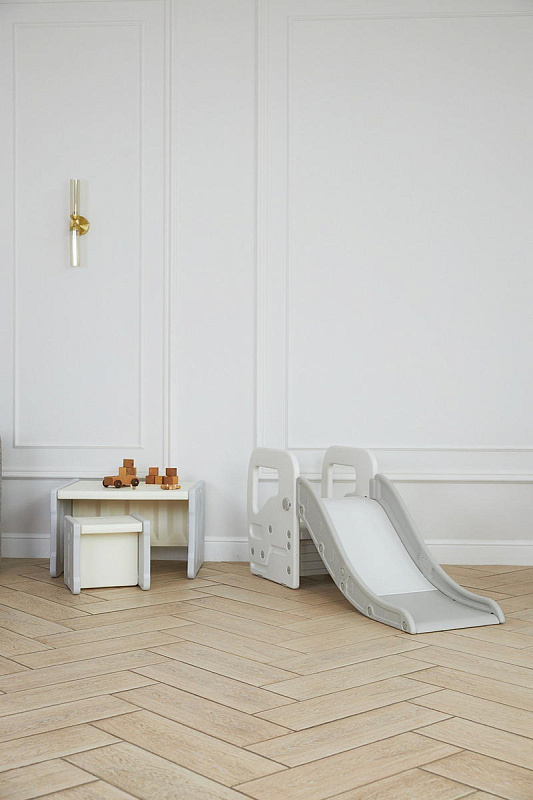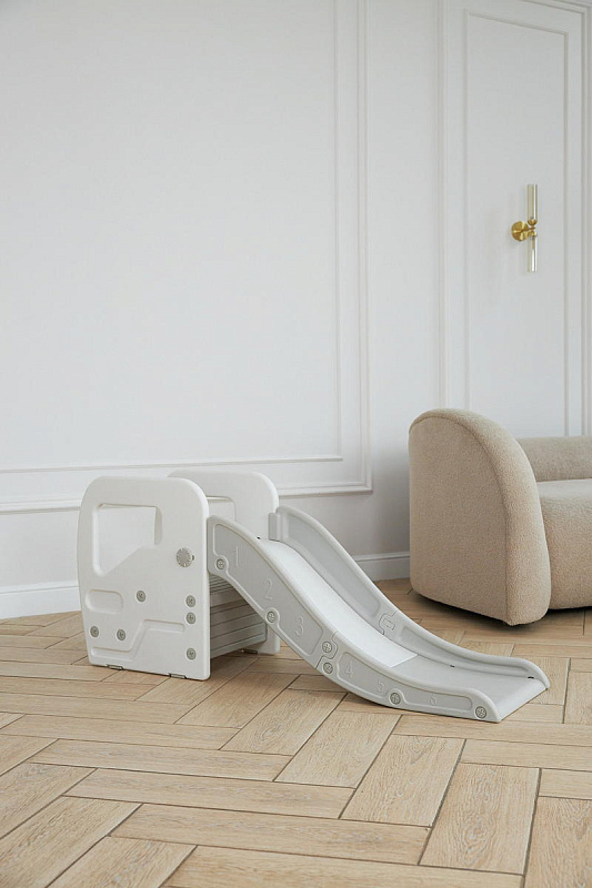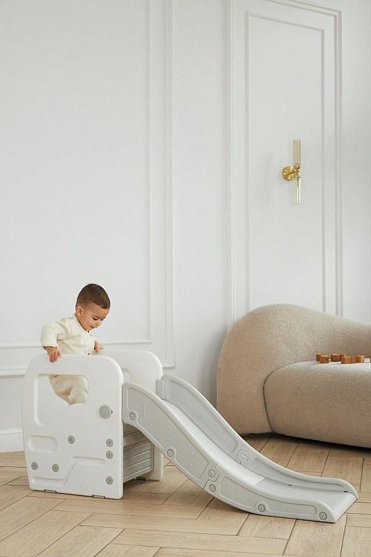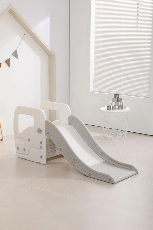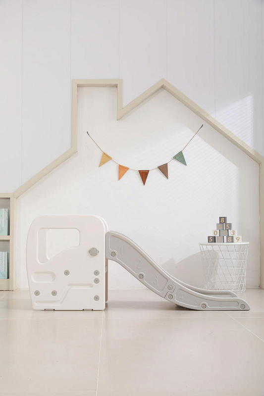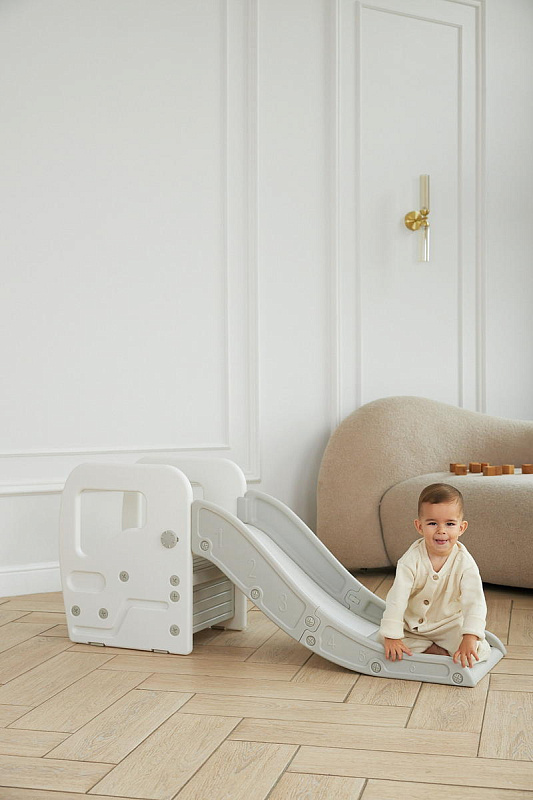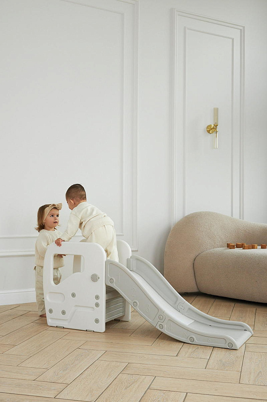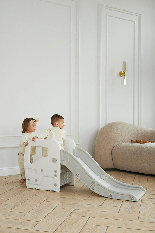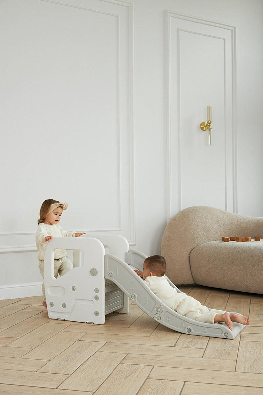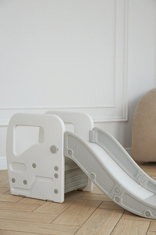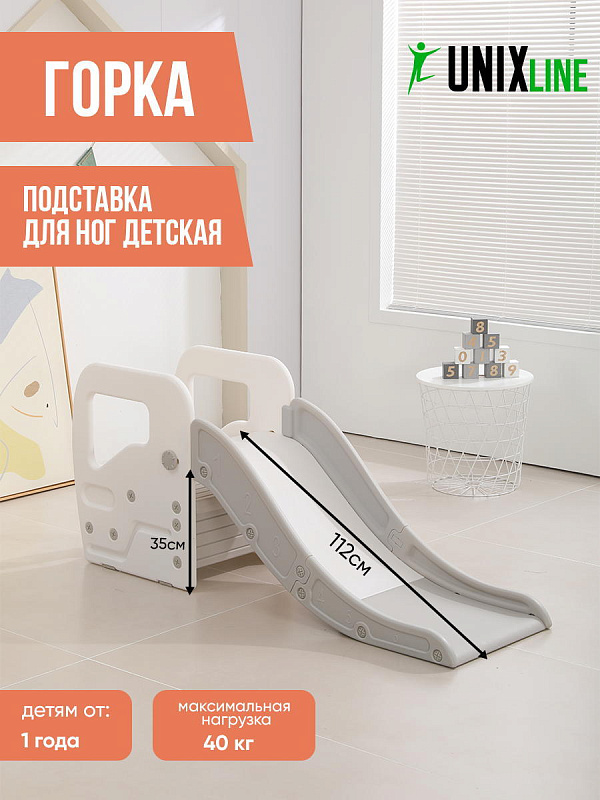 Детская горка + подставка для ног 2 в 1 Unix Kids Grey может быть использована как вместе со скатом горки, с которым надежно соединяется фиксаторами, так и отдельно.