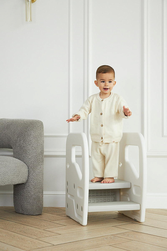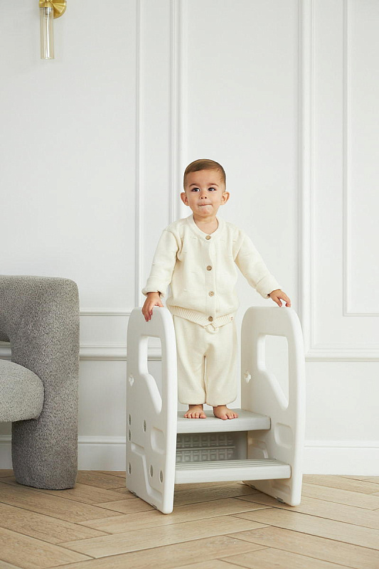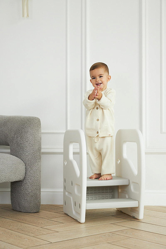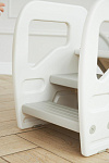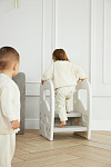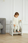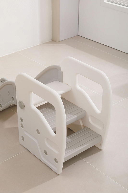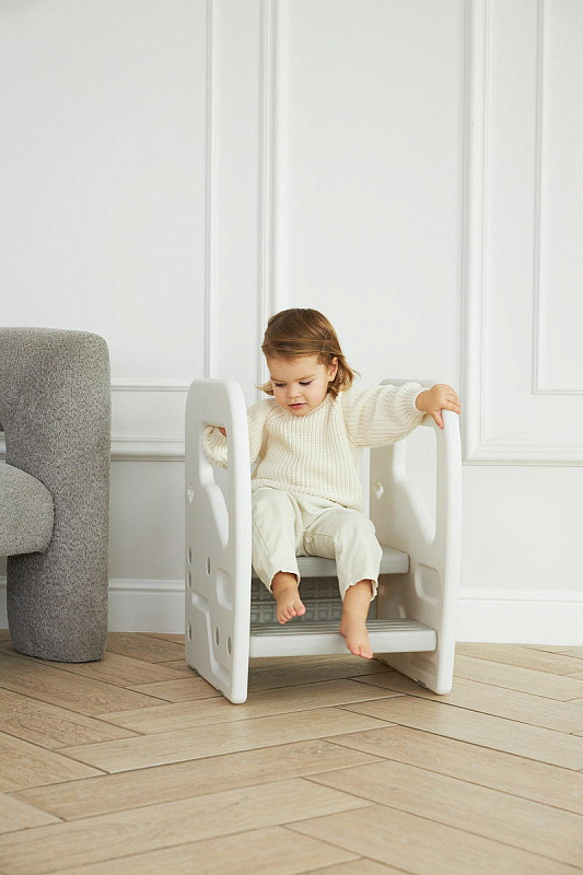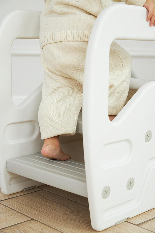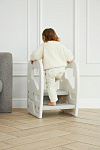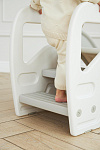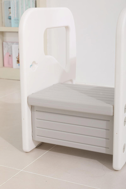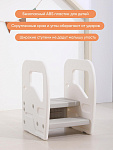 Подставка имеет две ступени и поручни, за которые можно держаться поднимаясь. Верхняя ступень является площадкой, на которой ребенок может стоять около раковины, когда чистит зубки, или около полки с книгами, если хочет достать повыше.