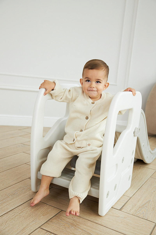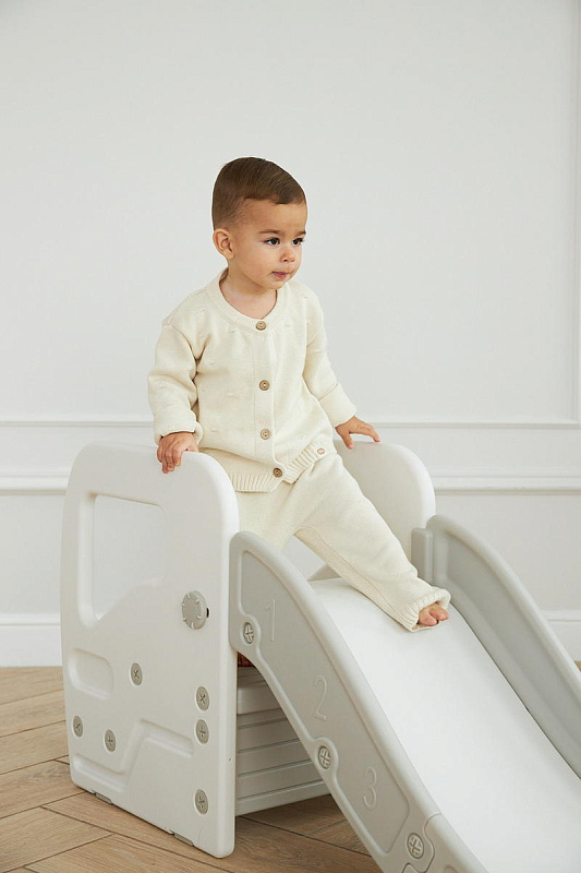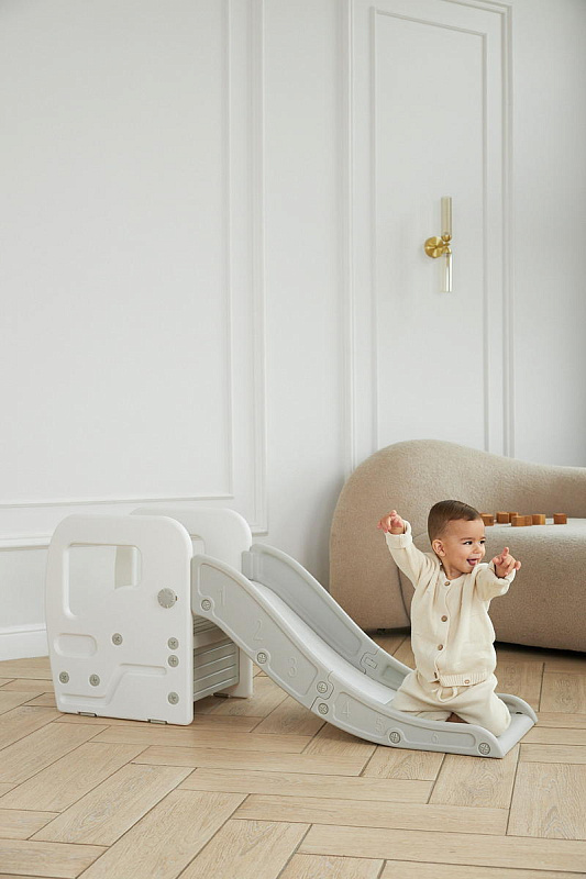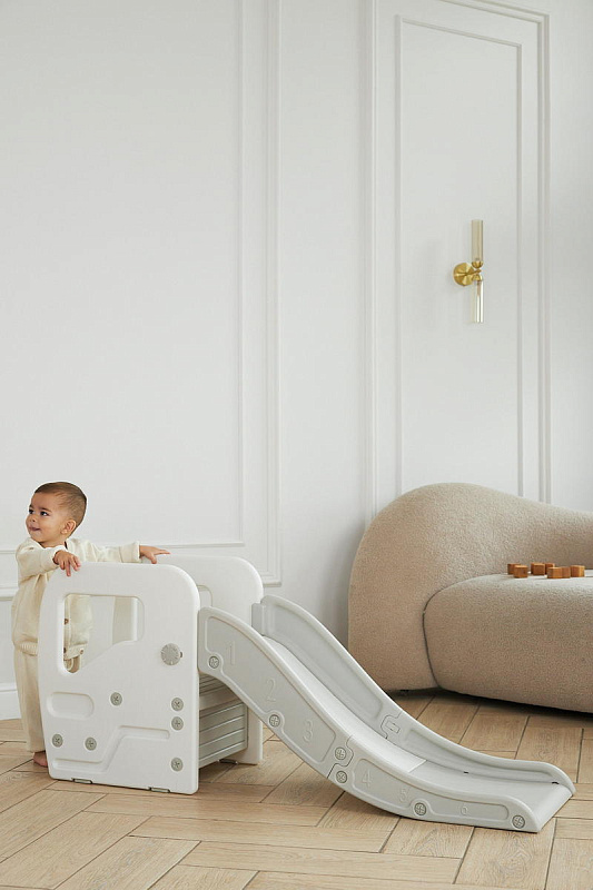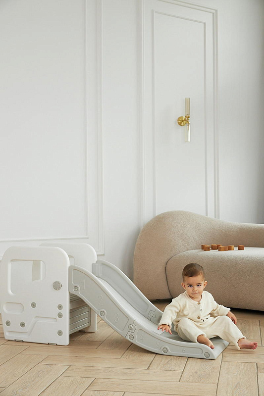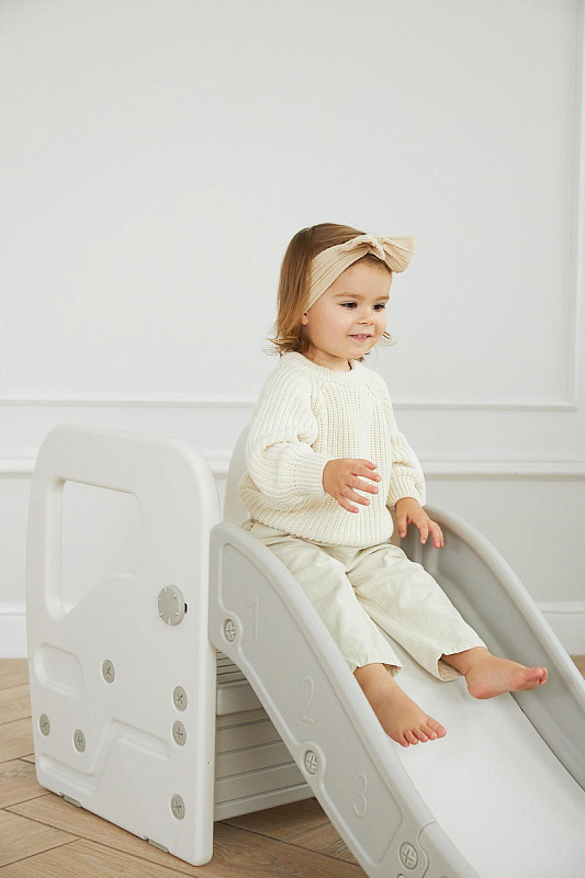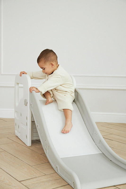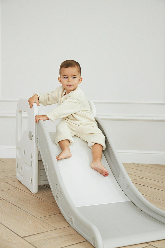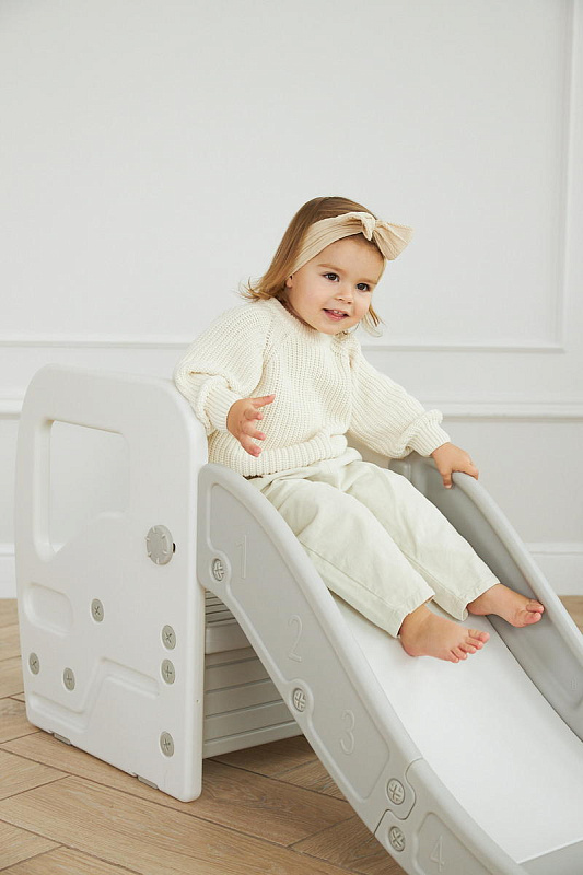 Детская горка + подставка для ног 2 в 1 Unix Kids Grey может быть использована как вместе со скатом горки, с которым надежно соединяется фиксаторами, так и отдельно.
