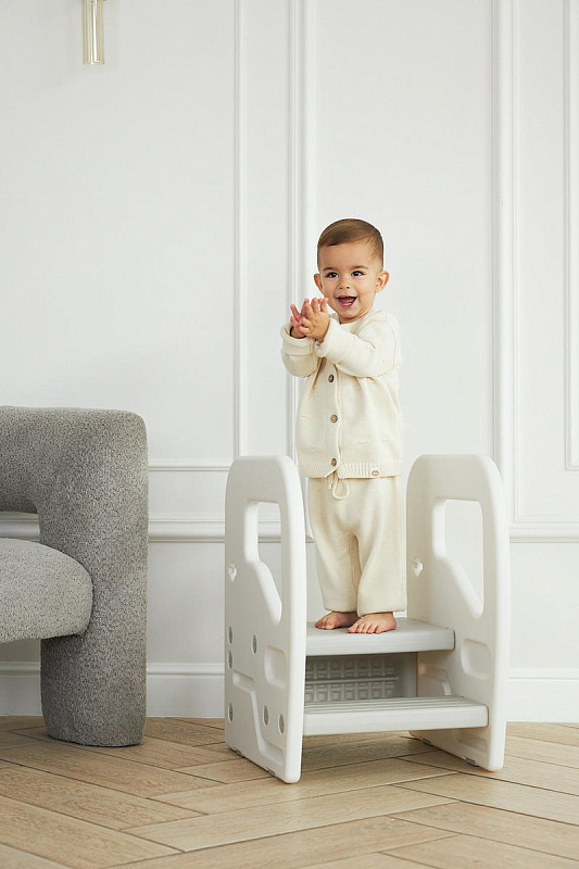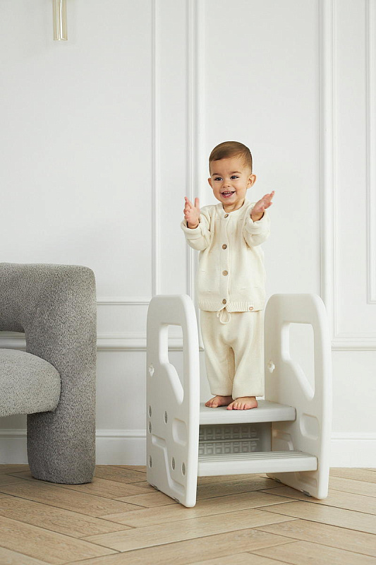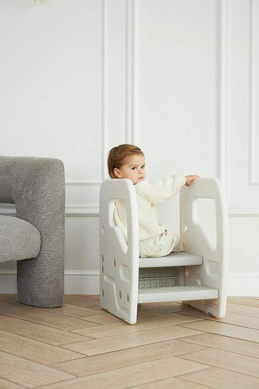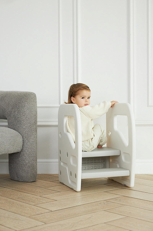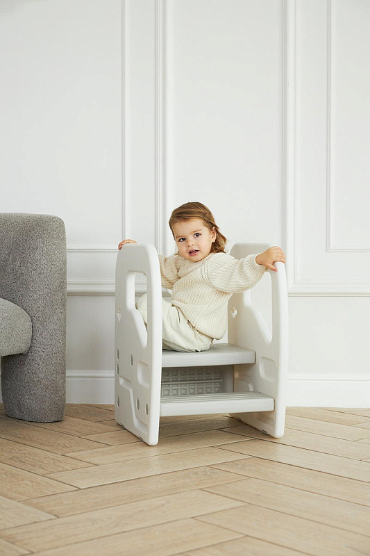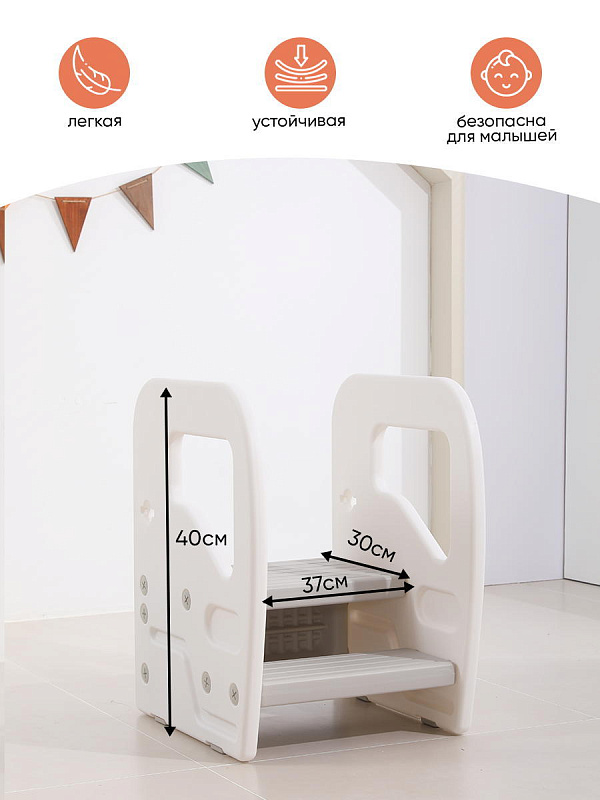 Подставка имеет две ступени и поручни, за которые можно держаться поднимаясь. Верхняя ступень является площадкой, на которой ребенок может стоять около раковины, когда чистит зубки, или около полки с книгами, если хочет достать повыше.