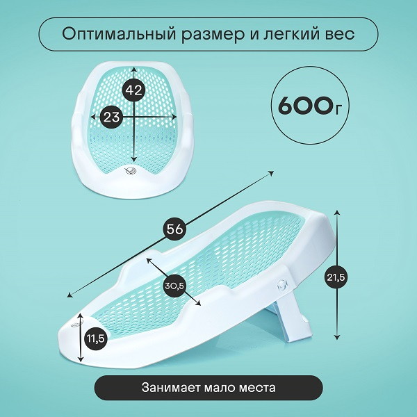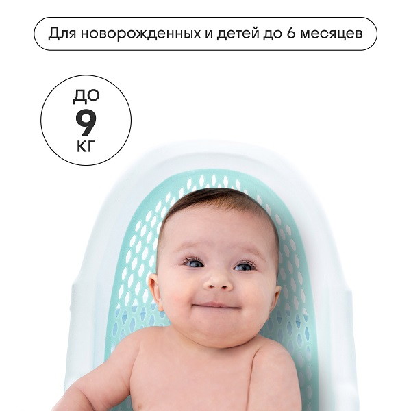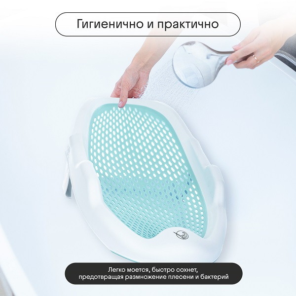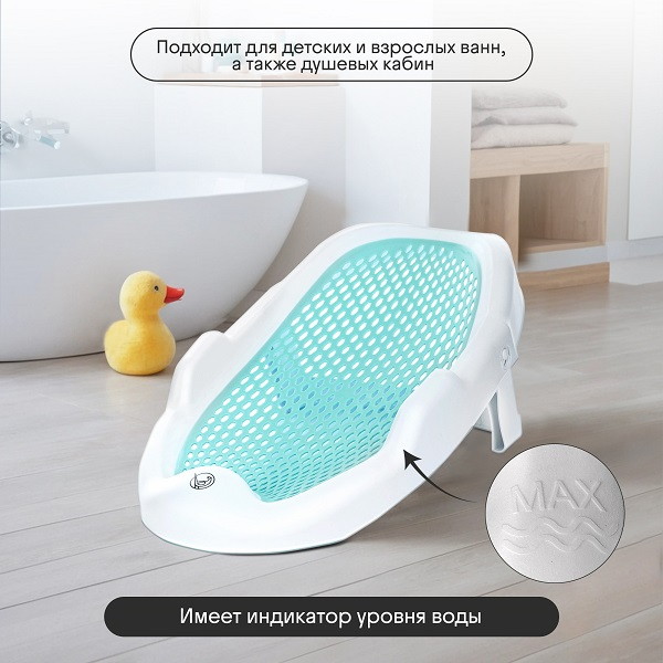 - Имеет эргономичную форму, напоминающую гамак или шезлонг, и обеспечивает отличную поддержку тела новорожденного во время купания.