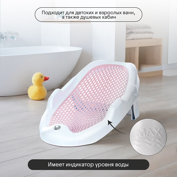 - Имеет эргономичную форму, напоминающую гамак или шезлонг, и обеспечивает отличную поддержку тела новорожденного во время купания.