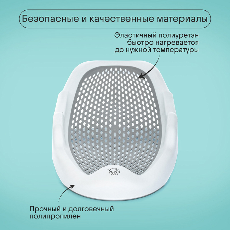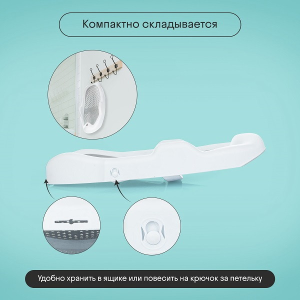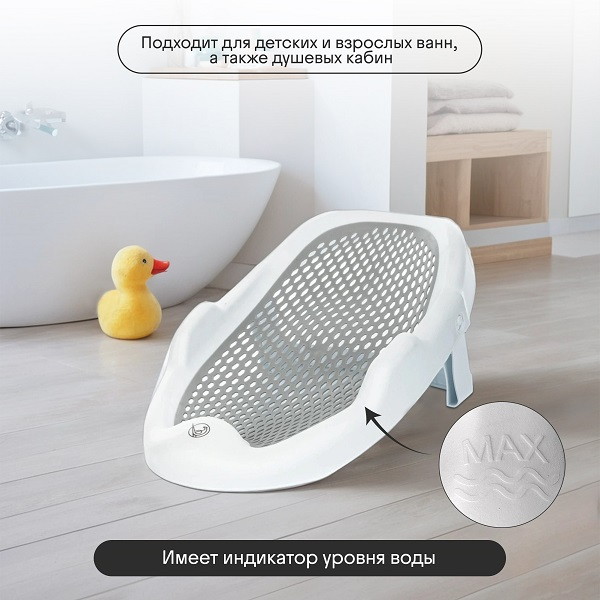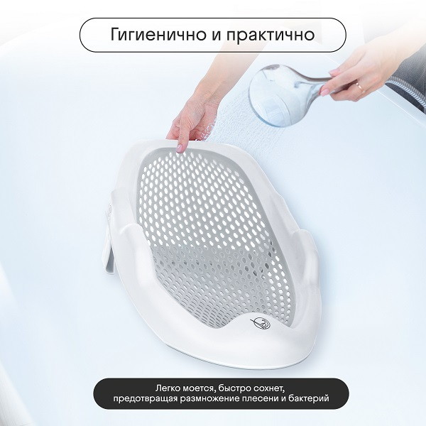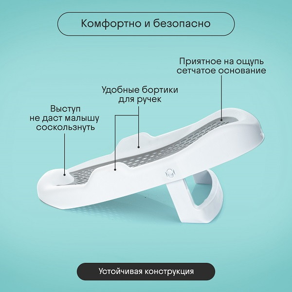 - Имеет эргономичную форму, напоминающую гамак или шезлонг, и обеспечивает отличную поддержку тела новорожденного во время купания.