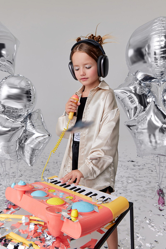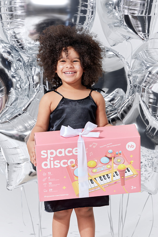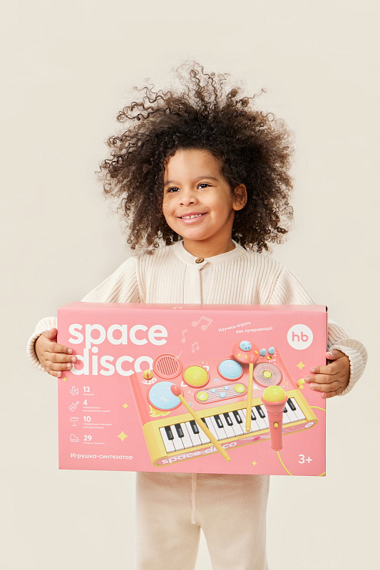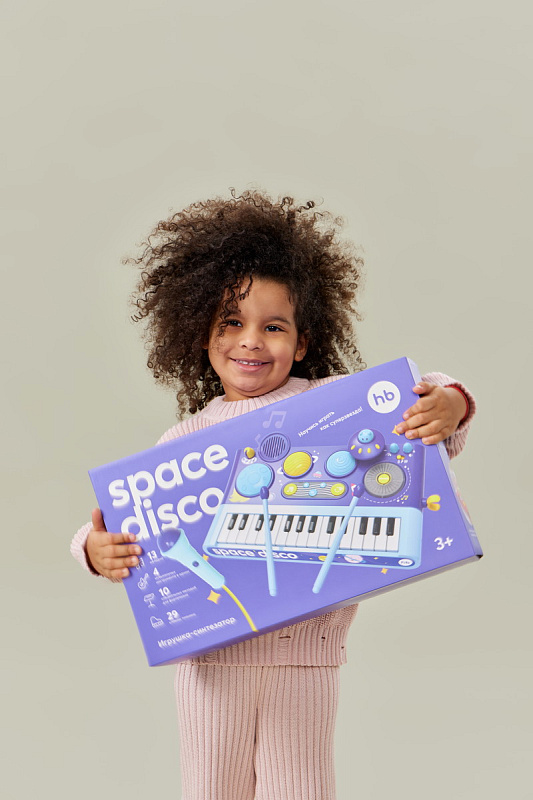 Игрушка SPACE DISCO представляет собой целую творческую студию для развития музыкальных талантов ребёнка. В неё входит синтезатор, барабанные палочки и микрофон. Малыш сможет разучивать известные мелодии или записывать собственные, почувствовать себя композитором, вокалистом и даже диджеем.