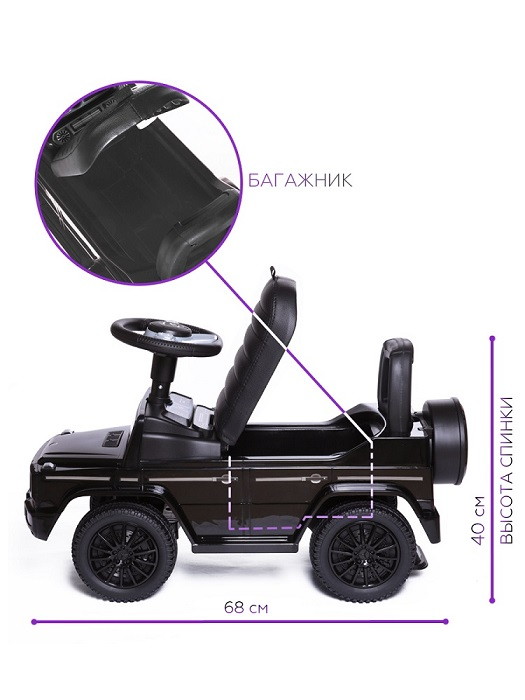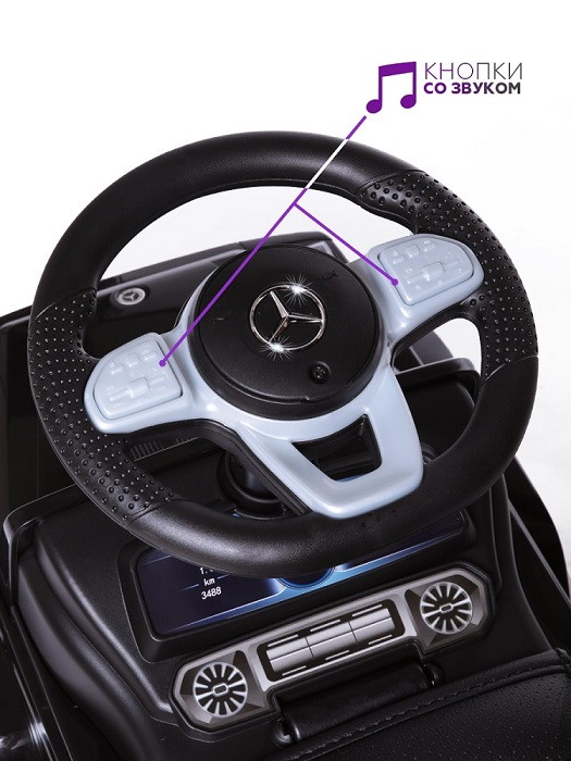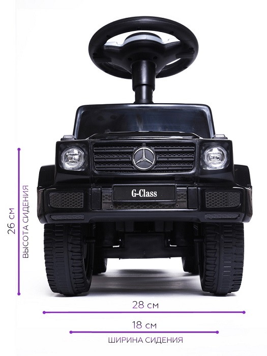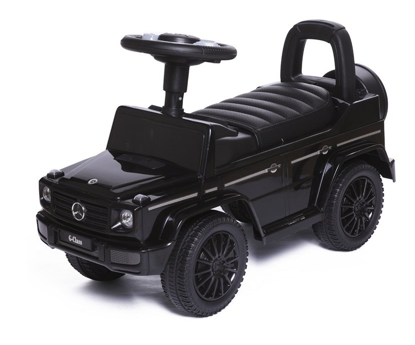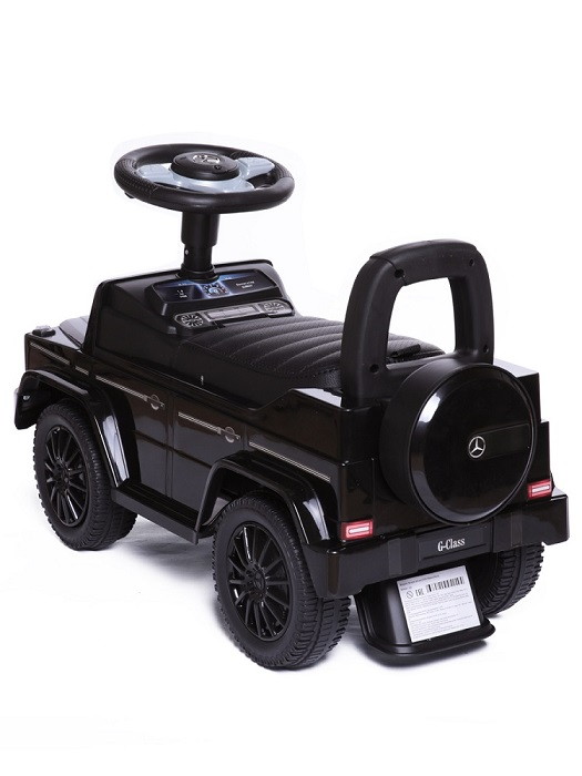 Каталка Mercedes Benz G350 - точная копия легендарного автомобиля, выполненная по лицензии бренда. Она буквально повторяет фирменные черты настоящего Мерседеса, поэтому выглядит так солидно и внушительно. Суть управления проста и понятна - толкайся ножками и езжай самостоятельно. Малыши, которые только осваивают первые шаги, могут держаться за спинку и двигаться вперед.