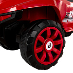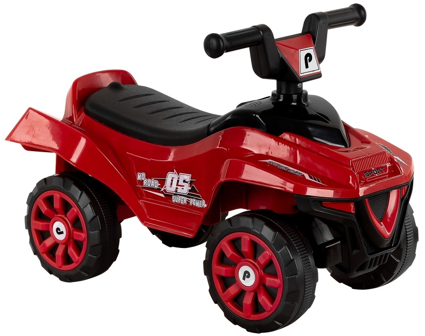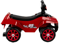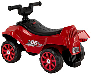 Модель выполнена в форме квадроцикла, имеет большие колеса с рисунком на шинах и просторное сиденье для комфортной посадки.