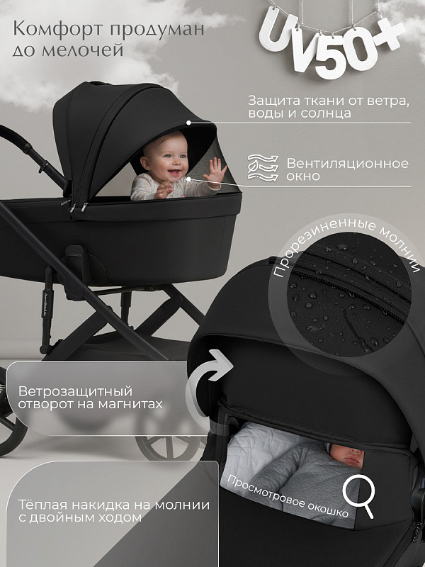 - Глубокий капюшон с защитой от ультрафиолета UV50 обеспечивает много тени для комфортного микроклимата, а скрытые секции полностью закроют малыша до самых ножек
