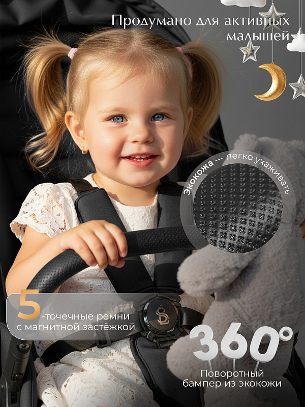 - Поворотный бампер на 360 градусов, а нижняя часть подножки отделана практичной экокожей - вы без труда избавитесь от следов, оставленных маленькими ботинками
