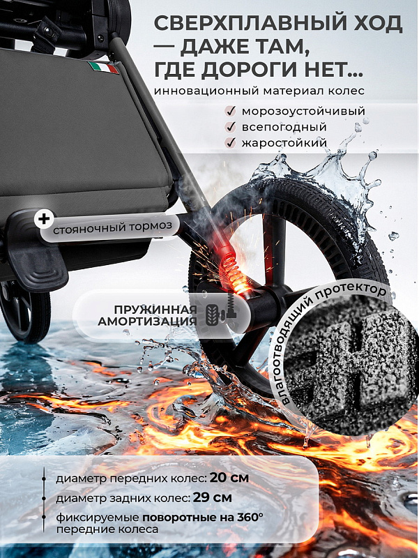 - Плавный ход на любом покрытии. Увеличенные колёса из высокомолекулярного сшитого полимера: