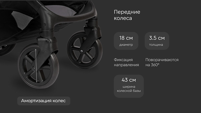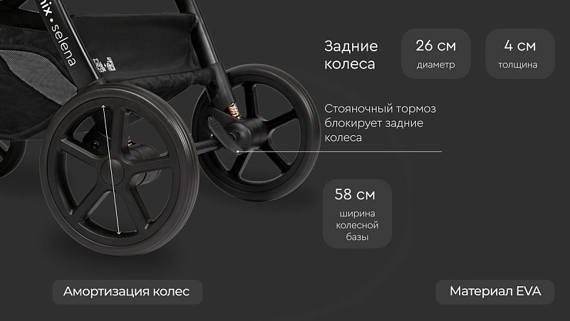 - поворотные передние колеса с фиксацией диаметром 18 см, задние колеса – 26 см, материал колес - EVA;