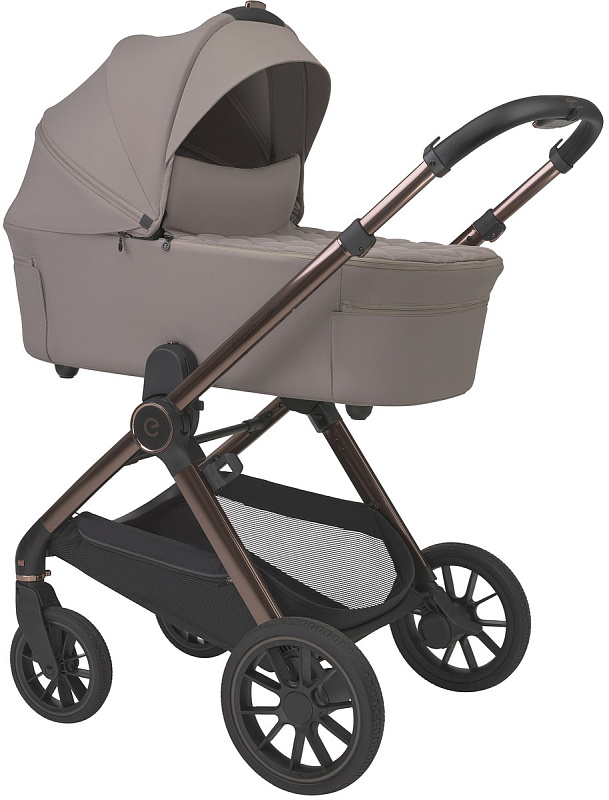 - Премиальный дизайн с медными акцентами. Элегантная отделка рамы и аксессуаров в цвете благородной приглушенной меди подчеркивает современный стиль коляски и делает её по-настоящему эффектной.