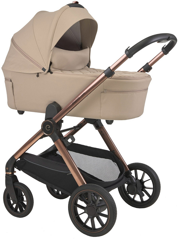 - Премиальный дизайн с медными акцентами. Элегантная отделка рамы и аксессуаров в цвете благородной приглушенной меди подчеркивает современный стиль коляски и делает её по-настоящему эффектной.