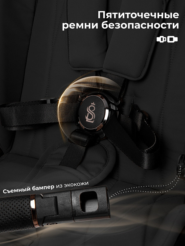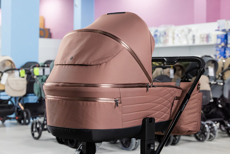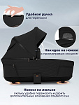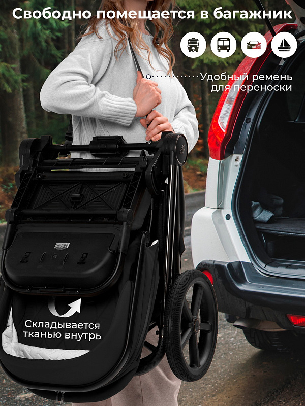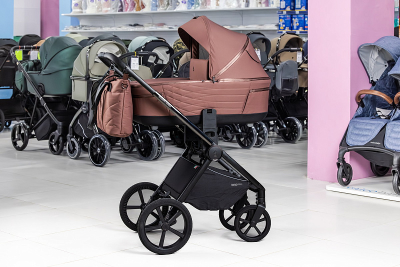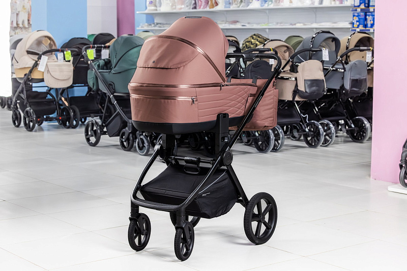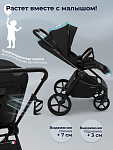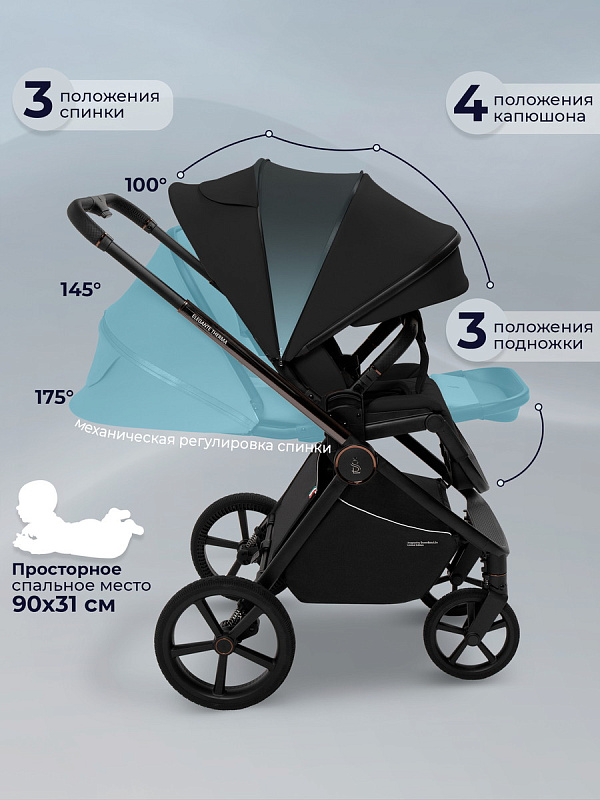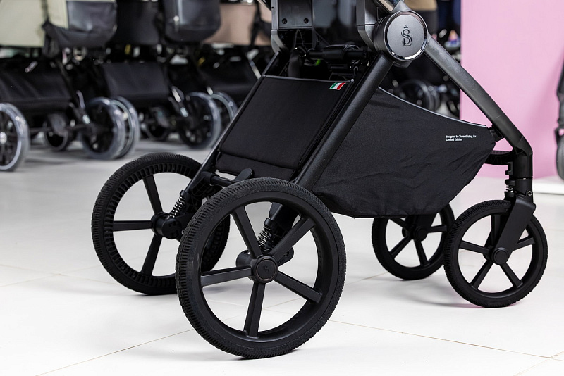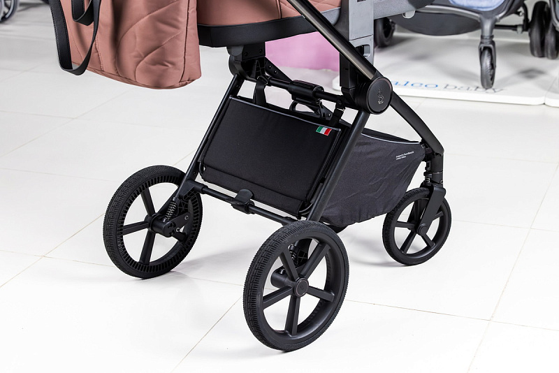 Увеличенные колеса из высокомолекулярного полимера, аналогичных тем, что используются в кроссовках Nike. Эти колеса гарантируют отличную амортизацию и сцепление с различными покрытиями, что делает каждую прогулку плавной и комфортной. Даже на неровных поверхностях ваш малыш не почувствует ни малейшего дискомфорта, а родителям будет легко управлять коляской благодаря высокоэффективной амортизации как передних, так и задних колес.
