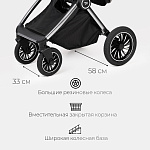 - Амортизация обеспечивает плавный ход и мягкость при движении, а большие резиновые колёса (28,5 и 20 см в диаметре) с протектором гарантируют отличную проходимость даже по неровным дорогам;