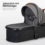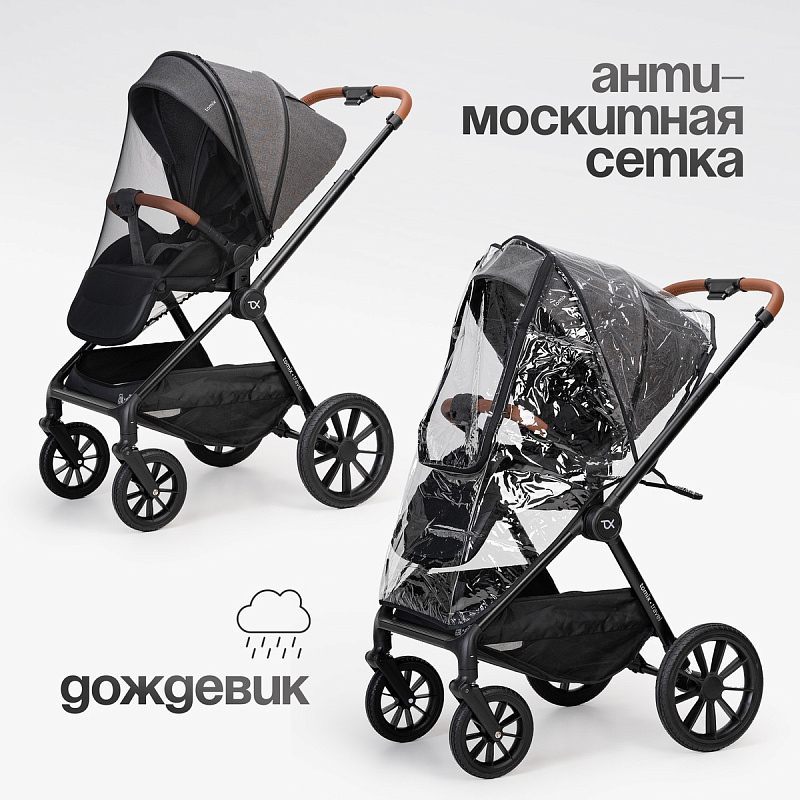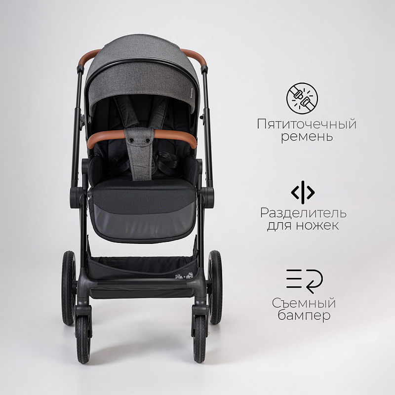 Пятиточечные ремни безопасности обеспечивают надёжное крепление малыша внутри коляски, а дождевик защищает от непогоды.