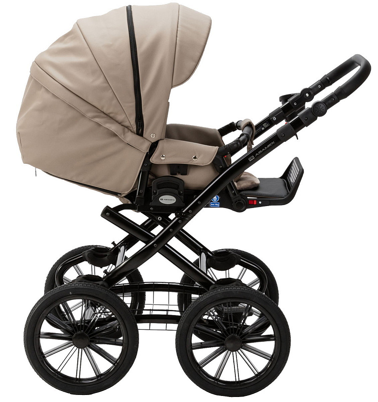 Эксклюзивный дизайн люльки в паре с элегантным классическим шасси придают коляске неповторимый шарм. А большие надувные колеса – высокую проходимость и плавное укачивание.