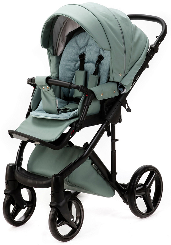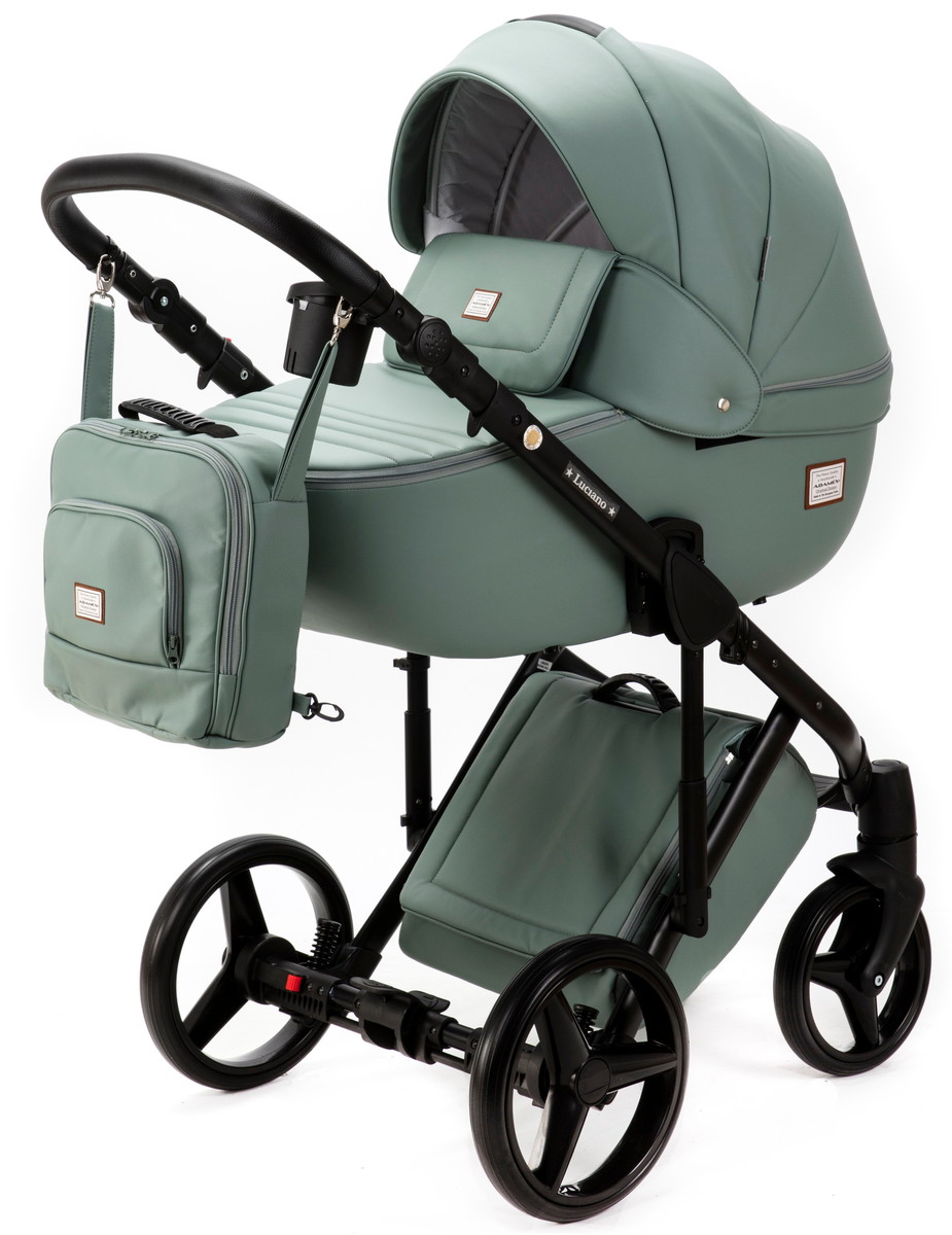 Детская коляска Adamex Luciano Deluxe 3 в 1 Q114-С (СЕРО-ЗЕЛЕН.КОЖА 100%+ЧЕРАЯ РАМА)