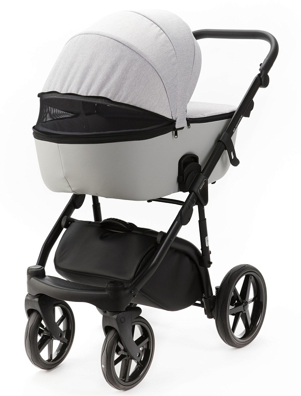 Корпус люльки пластиковый, обтянут эко-кожей. В донышко люльки встроено регулируемое вентиляционное окно. Люлька оборудована регулируемым по высоте подголовником, регуляция расположена с внешней стороны.Внутренняя обивка выполнена из хлопковой ткани.Люлька реверсивная, ее можно установить в положение «ребенок лицом к родителю», «ребенок лицом к направлению движения».Капюшон люльки 3-х сегментный капюшон с козырьком от солнца и дополнительным 4-м сегментом на молнии, под которым расположена анти-москитная сетка для проветривания. В капюшон встроена ручка для переноски люльки, ручка расположена под молнией.Накидка крепится к люльке с помощью молнии. Накидка оснащена откидным клапаном под клапаном расположено смотровое окно.
