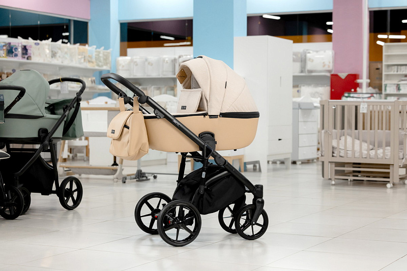 Корпус люльки пластиковый, обтянут эко-кожей. В донышко люльки встроено регулируемое вентиляционное окно. Люлька оборудована регулируемым по высоте подголовником, регуляция расположена с внешней стороны.Внутренняя обивка выполнена из хлопковой ткани.Люлька реверсивная, ее можно установить в положение «ребенок лицом к родителю», «ребенок лицом к направлению движения».Капюшон люльки 3-х сегментный капюшон с козырьком от солнца и дополнительным 4-м сегментом на молнии, под которым расположена анти-москитная сетка для проветривания. В капюшон встроена ручка для переноски люльки, ручка расположена под молнией.Накидка крепится к люльке с помощью молнии. Накидка оснащена откидным клапаном под клапаном расположено смотровое окно.