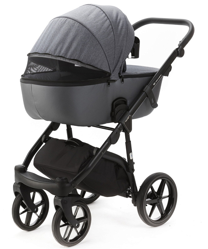 Корпус люльки пластиковый, обтянут эко-кожей. В донышко люльки встроено регулируемое вентиляционное окно. Люлька оборудована регулируемым по высоте подголовником, регуляция расположена с внешней стороны.Внутренняя обивка выполнена из хлопковой ткани.Люлька реверсивная, ее можно установить в положение «ребенок лицом к родителю», «ребенок лицом к направлению движения».Капюшон люльки 3-х сегментный капюшон с козырьком от солнца и дополнительным 4-м сегментом на молнии, под которым расположена анти-москитная сетка для проветривания. В капюшон встроена ручка для переноски люльки, ручка расположена под молнией.Накидка крепится к люльке с помощью молнии. Накидка оснащена откидным клапаном под клапаном расположено смотровое окно.