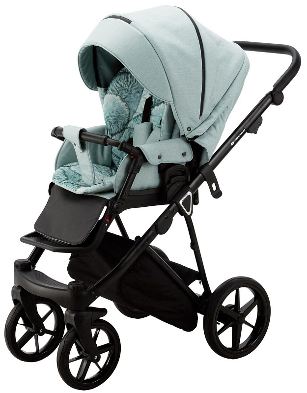 Детская коляска изготовлена из качественных материалов, верхнее покрытие из влагоотталкивающей ткани. В капюшоне предусмотрена сетка для проветривания. Эргономичный прогулочный блок оснащен удлиняющимся козырьком. Спинка сиденья регулируемая, с мягкими ремнями безопасности. Шасси оборудованы не прокалываемыми колесами с амортизаторами.