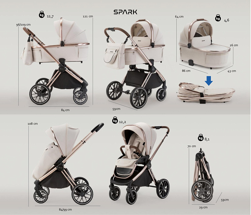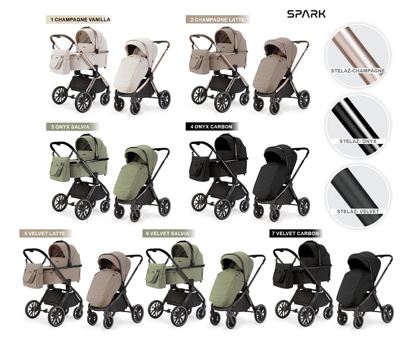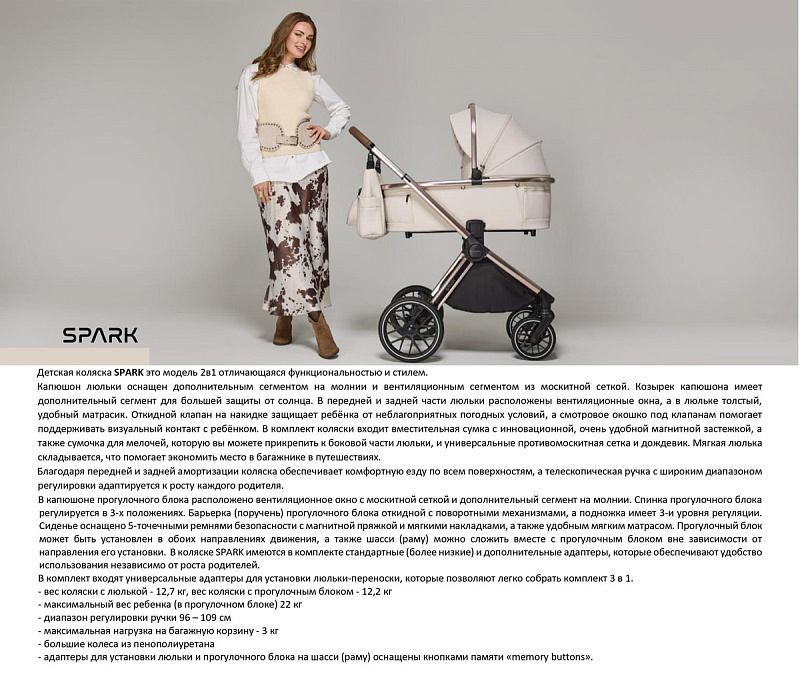 Детская коляска SPARK это модель 2в1 отличающаяся функциональностью и стилем. Капюшон люльки оснащен дополнительным сегментом на молнии и вентиляционным сегментом из москитной сеткой. Козырек капюшона имеет дополнительный сегмент для большей защиты от солнца. В передней и задней части люльки расположены вентиляционные окна, а в люльке толстый, удобный матрасик. Откидной клапан на накидке защищает ребёнка от неблагоприятных погодных условий, а смотровое окошко под клапанам помогает поддерживать визуальный контакт с ребёнком. В комплект коляски входит вместительная сумка с инновационной, очень удобной магнитной застежкой, а также сумочка для мелочей, которую вы можете прикрепить к боковой части люльки, и универсальные противомоскитная сетка и дождевик. Мягкая люлька складывается, что помогает экономить место в багажнике в путешествиях. Благодаря передней и задней амортизации коляска обеспечивает комфортную езду по всем поверхностям, а телескопическая ручка с широким диапазоном регулировки адаптируется к росту каждого родителя. В капюшоне прогулочного блока расположено вентиляционное окно с москитной сеткой и дополнительный сегмент на молнии. Спинка прогулочного блока регулируется в 3-х положениях. Барьерка (поручень) прогулочного блока откидной с поворотными механизмами, а подножка имеет 3-и уровня регуляции. Сиденье оснащено 5-точечными ремнями безопасности с магнитной пряжкой и мягкими накладками, а также удобным мягким матрасом. Прогулочный блок может быть установлен в обоих направлениях движения, а также шасси (раму) можно сложить вместе с прогулочным блоком вне зависимости от направления его установки. В коляске SPARK имеются в комплекте стандартные (более низкие) и дополнительные адаптеры, которые обеспечивают удобство использования независимо от роста родителей.