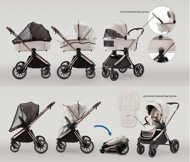 В комплект входят универсальные адаптеры для установки люльки-переноски, которые позволяют легко собрать комплект 3 в 1.