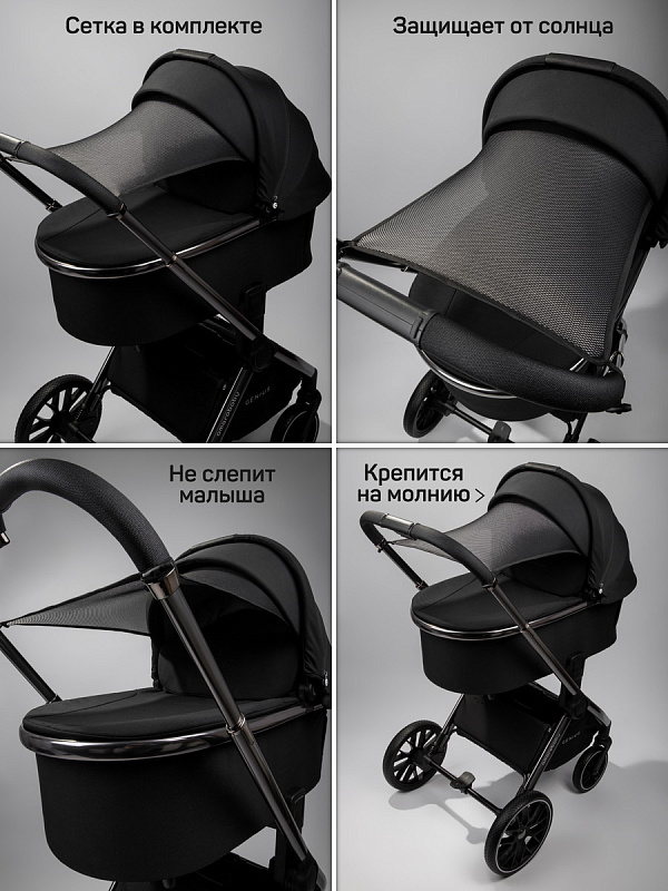 В комплекте есть солнцезащитная накидка. Для теплого времени года москитная сетка. Коляска для новорожденных изготовлена из премиум материалов, ткань не выгорает на солнце (со специальной пропиткой spf 50+). Для жаркого лета предусмотрены большие вентиляционные окошки, которые есть и на люльке, и на прогулочном блоке.