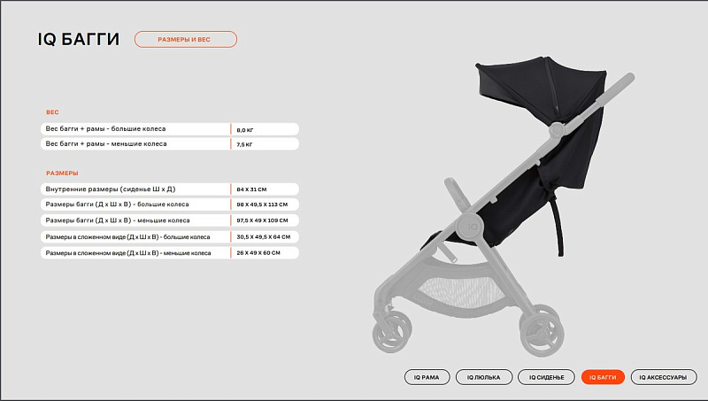 - Размеры базовой рамы- 30,5x54,5x64 см (большие колеса), 26x54x60 см (меньшие колеса)