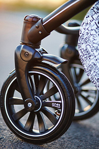 - Передние 360º-поворотные колеса обеспечивают легкость управления Anex Sport даже между узкими стойками супермаркета без необходимости приподнимать переднюю часть коляски