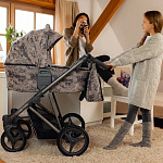 Конструкция данно коляски позволяет установить на нее люльку, сиденье прогулочного блока или автомобильное кресло. Люлька и прогулочный блок реверсивные, их можно устанавливать как «лицом к маме», так и «лицом от мамы».Шасси: