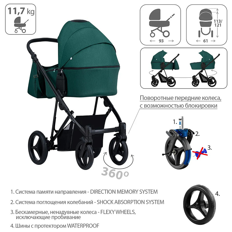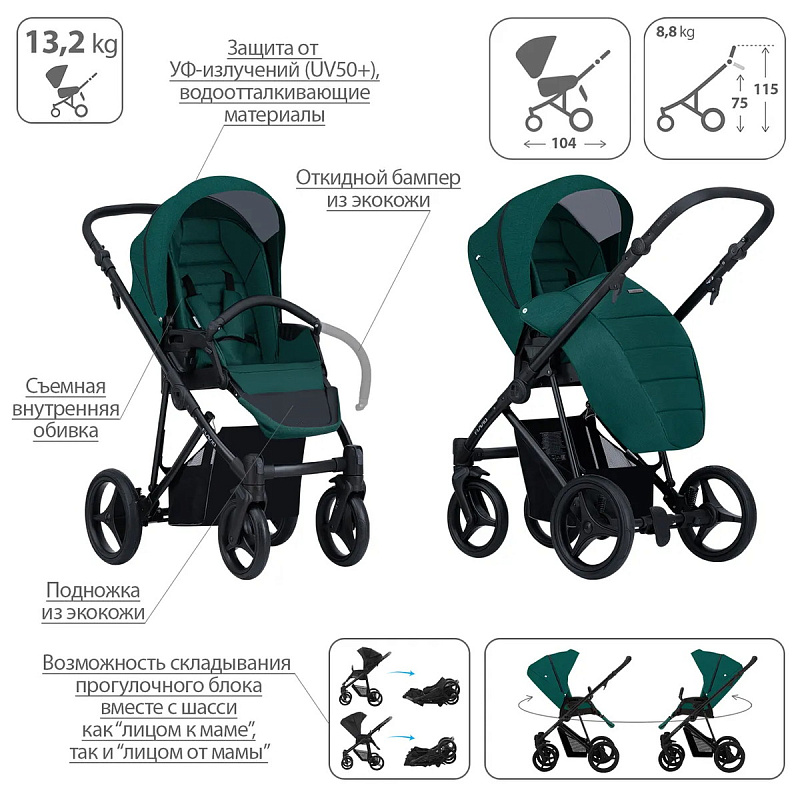 Конструкция данно коляски позволяет установить на нее люльку, сиденье прогулочного блока или автомобильное кресло. Люлька и прогулочный блок реверсивные, их можно устанавливать как «лицом к маме», так и «лицом от мамы».Шасси: