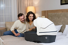 Люлька отличается прочной и легкой конструкцией с мягким и уютным внутренним пространством. Капюшон из экокожи регулируется, а накидка оснащена дополнительным отворотом, который защищает малыша от ветра и солнца. Вентиляционные решетки на дне люльки обеспечивают постоянный приток свежего воздуха, а регулируемый рычаг позволяет расположить ребенка в полулежачем положении.