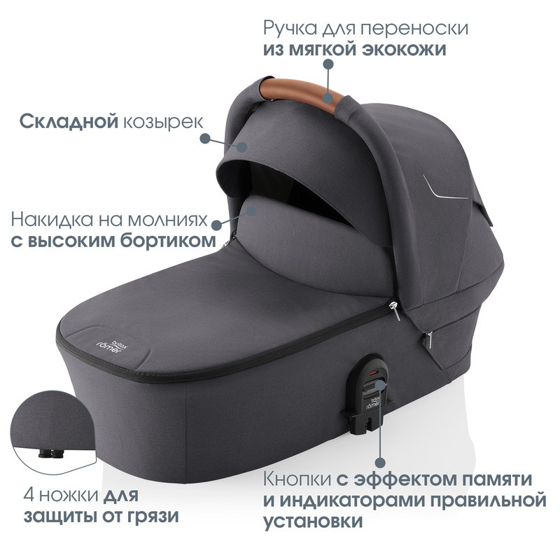 - Люлька надежно крепится к шасси коляски без дополнительных адаптеров и легко снимается одной рукой