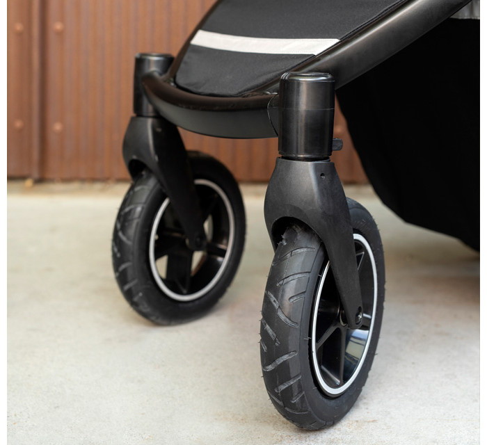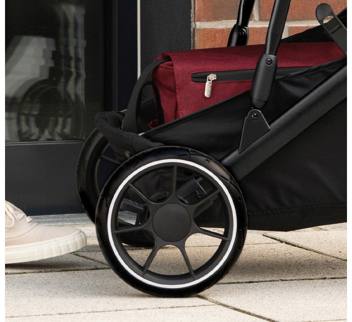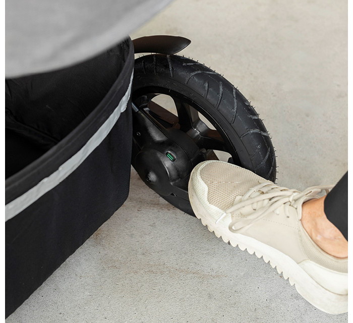 Поворотные передние колёса для удобного маневрирования в узких торговых проходах и режим блокировки для использования на пересечённой местности. Непрокалываемые шины из прочной резины наполнены вспененным полиуретаном для мягкого и комфортного хода коляски даже на неровной дороге. Центральная передняя подвеска для плавного хода по брусчатке и просёлочной дороге, чтобы не тревожить сон малыша. Удобный тормоз флипп-флопп с индикатором активации для удобной фиксации и разблокировки коляски, чтобы не пачкать обувь. Компактные габариты для комфортного передвижения даже в самых узких пространствах. Благодаря автоматической фиксации, она останется в сложенном положении, сколько